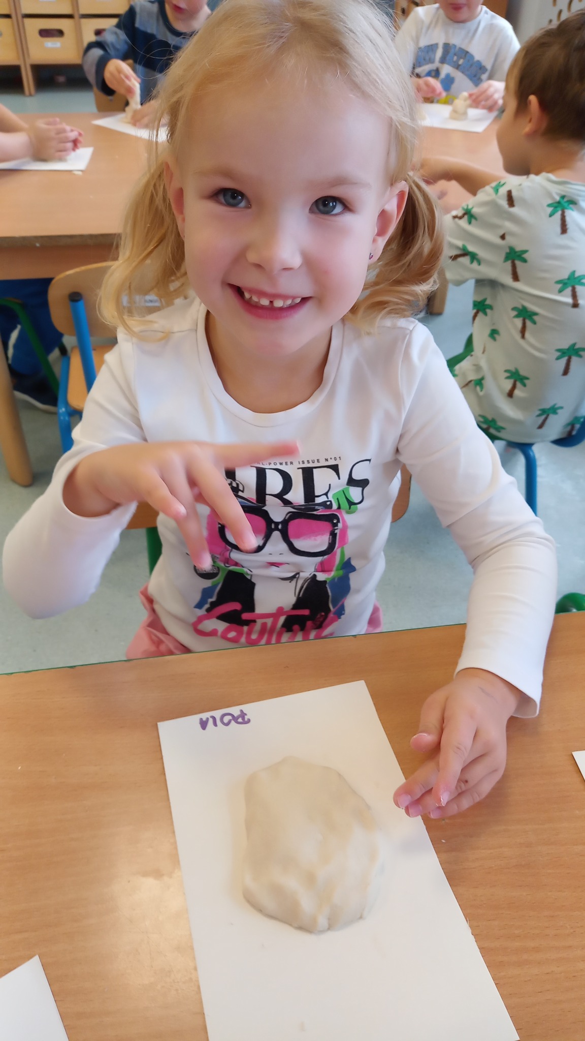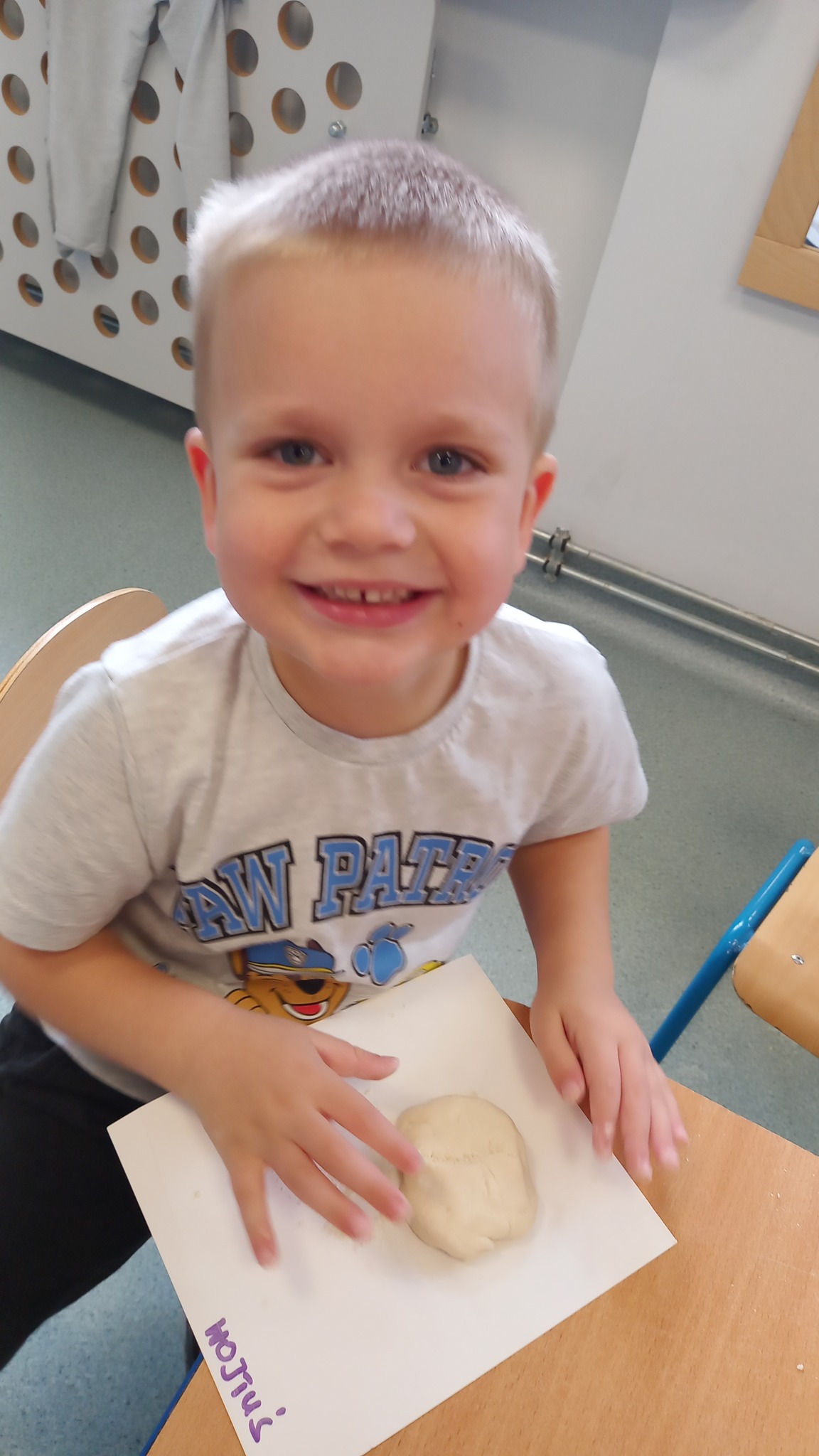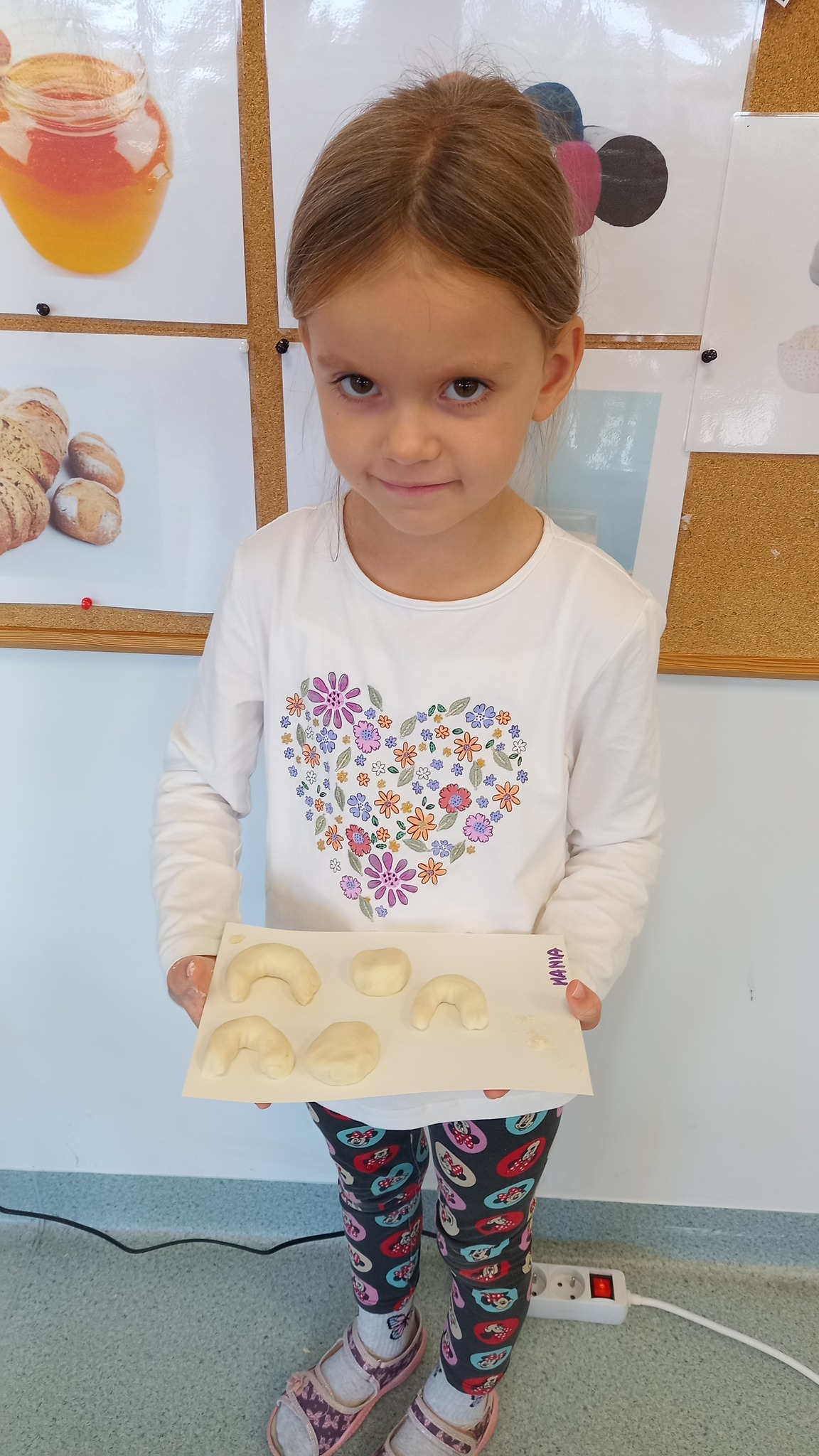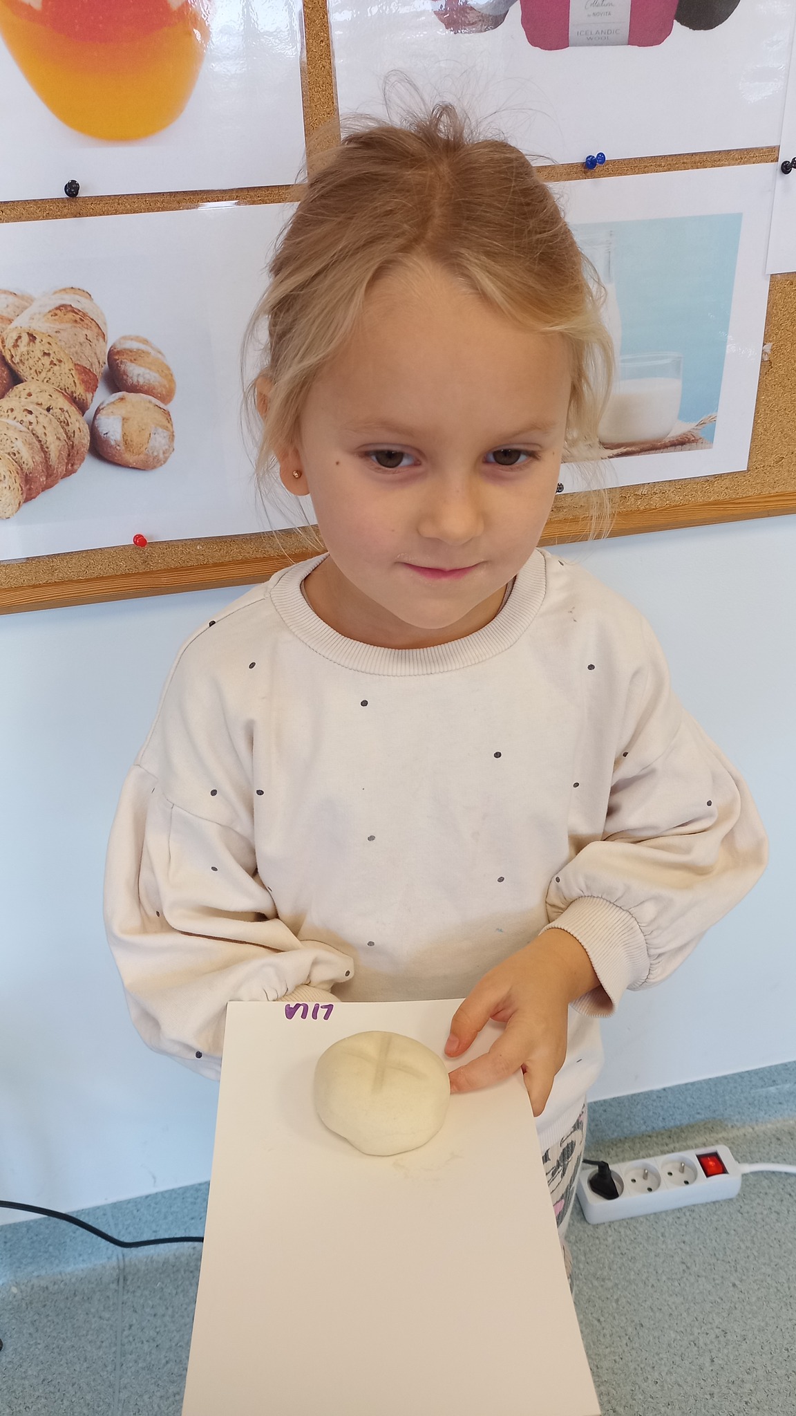 Zabawy sensoryczne z wykorzystaniem masy solnej. Dziś nasze Delfinki wcieliły się w rolę piekarzy i uformowały z masy bułeczki i rogaliki.