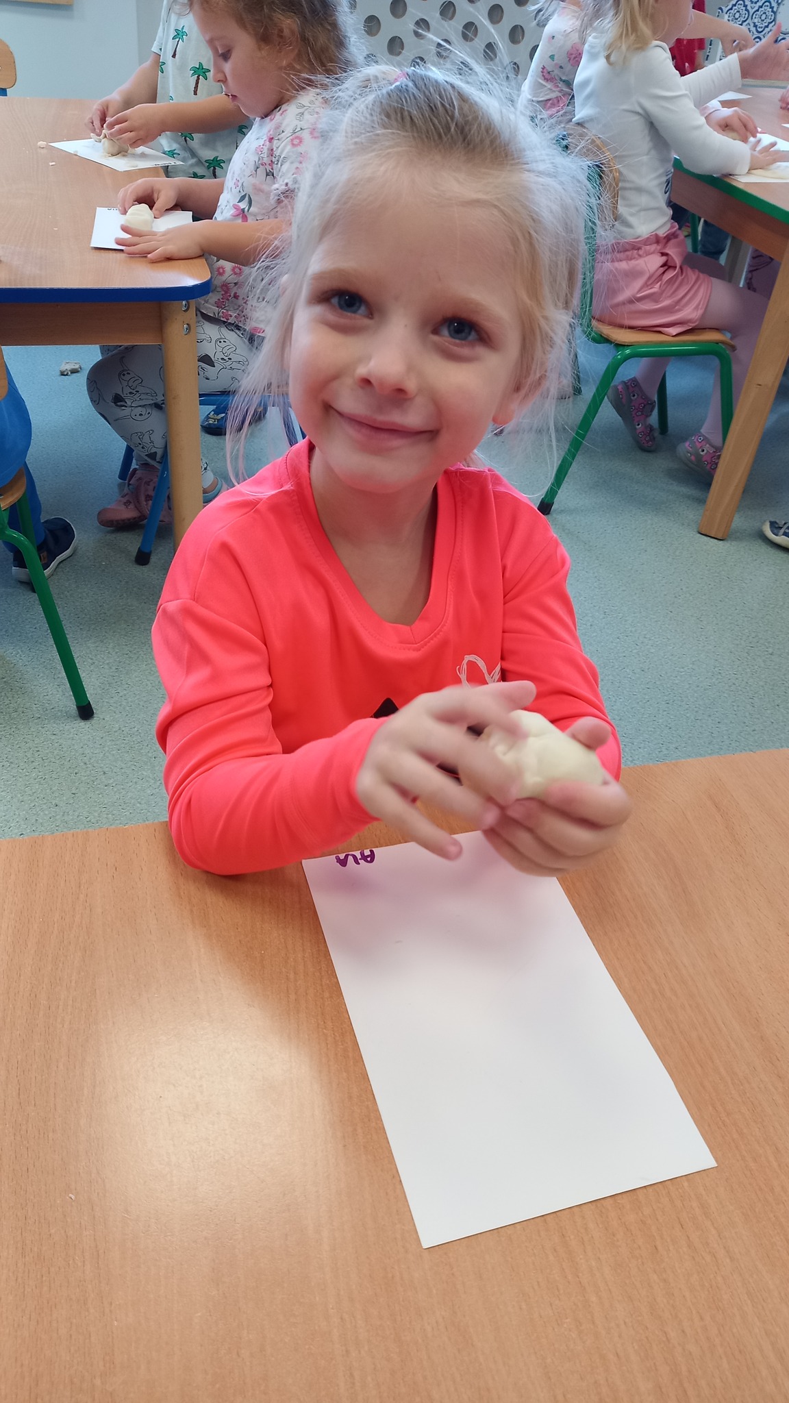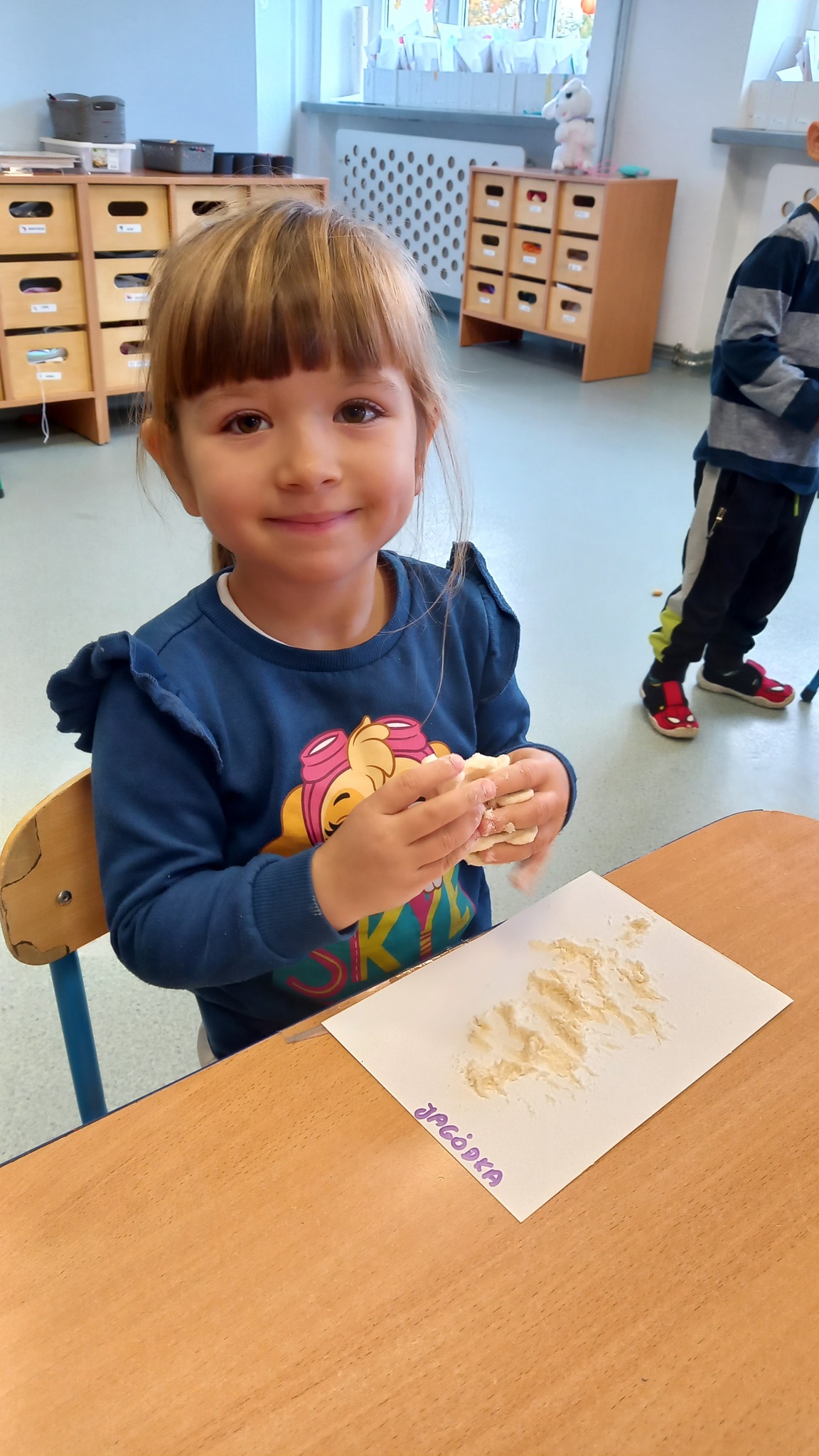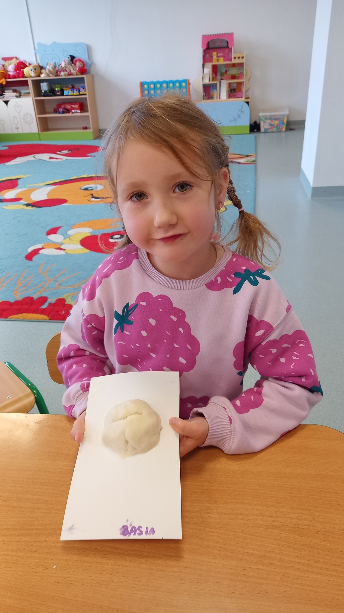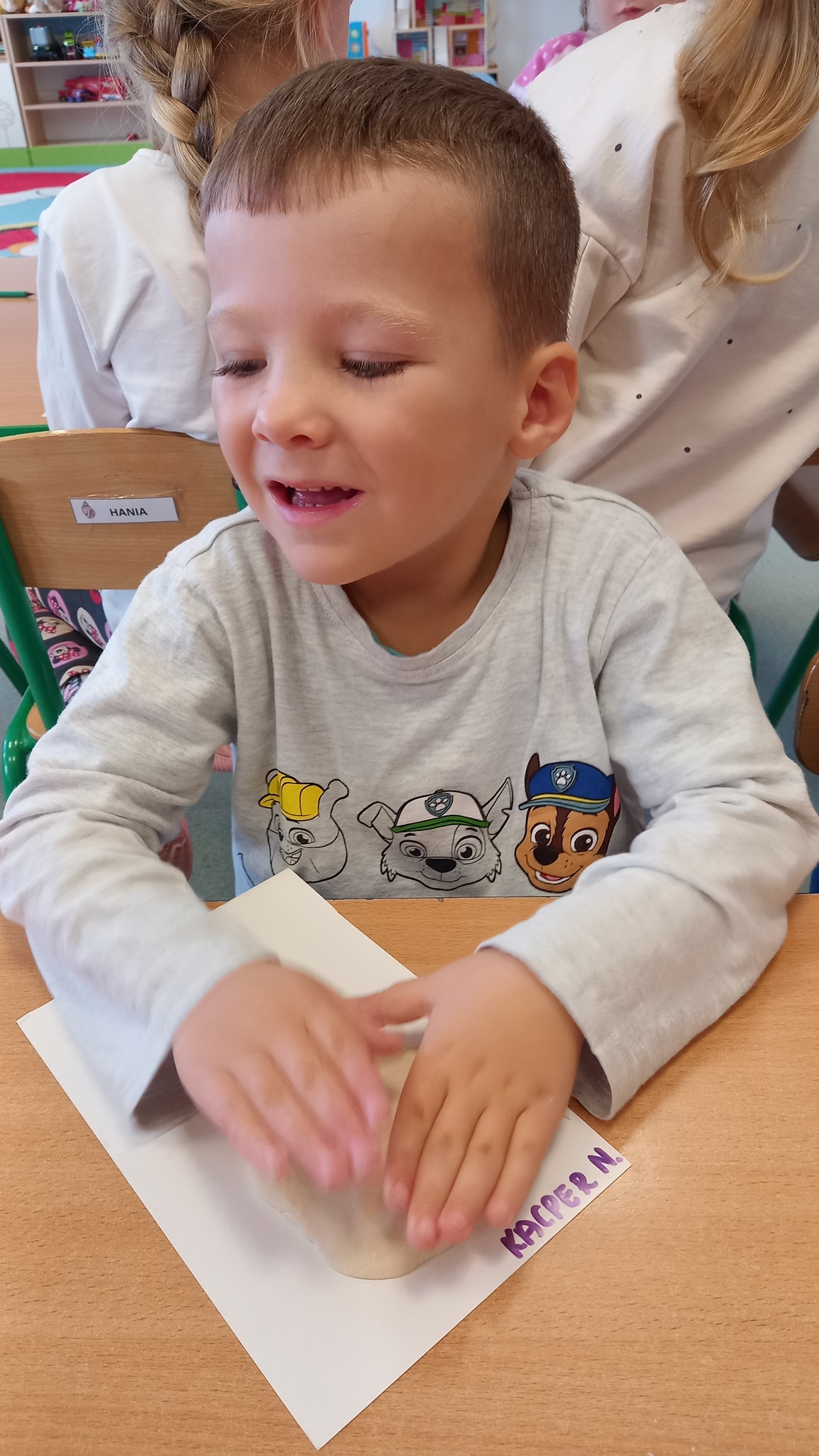 Zabawy sensoryczne z wykorzystaniem masy solnej. Dziś nasze Delfinki wcieliły się w rolę piekarzy i uformowały z masy bułeczki i rogaliki.