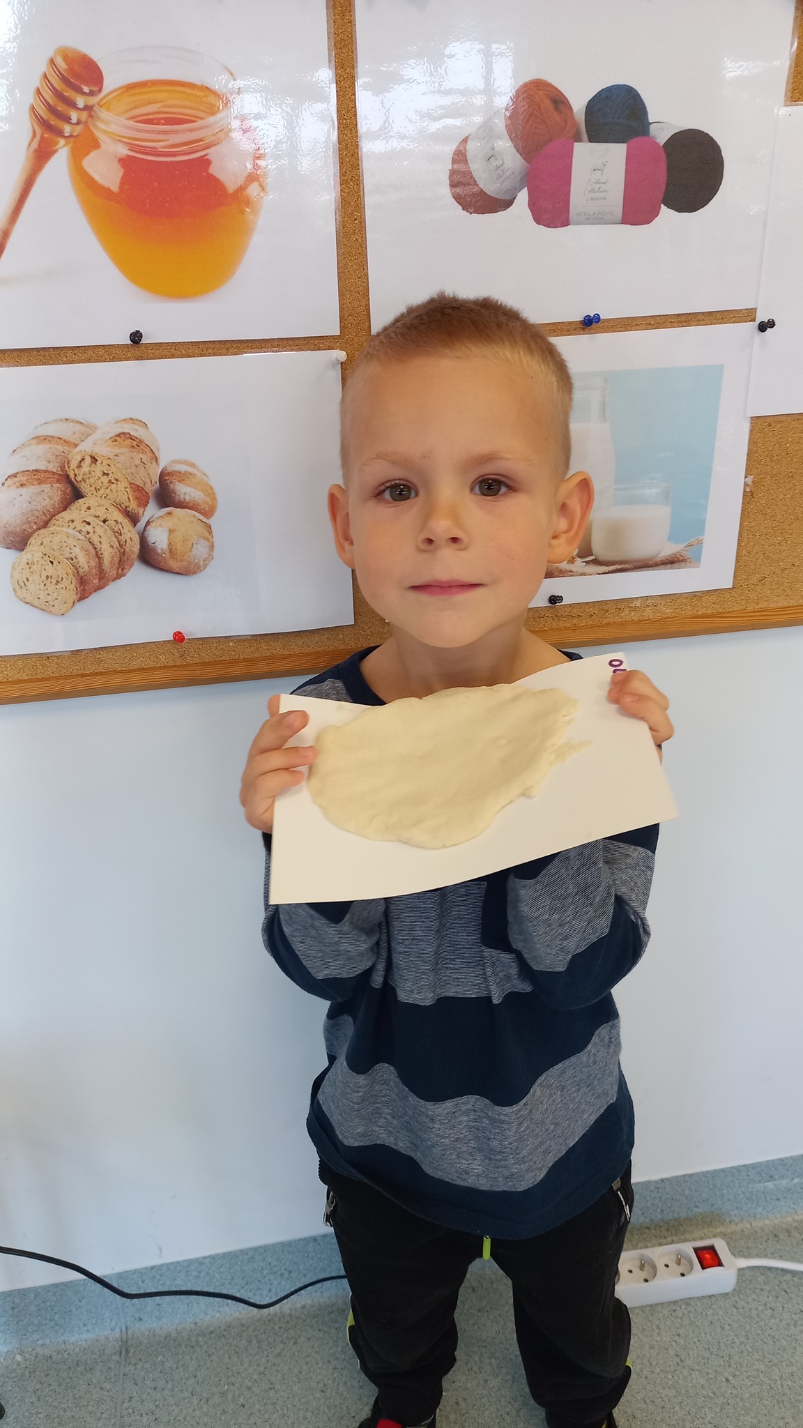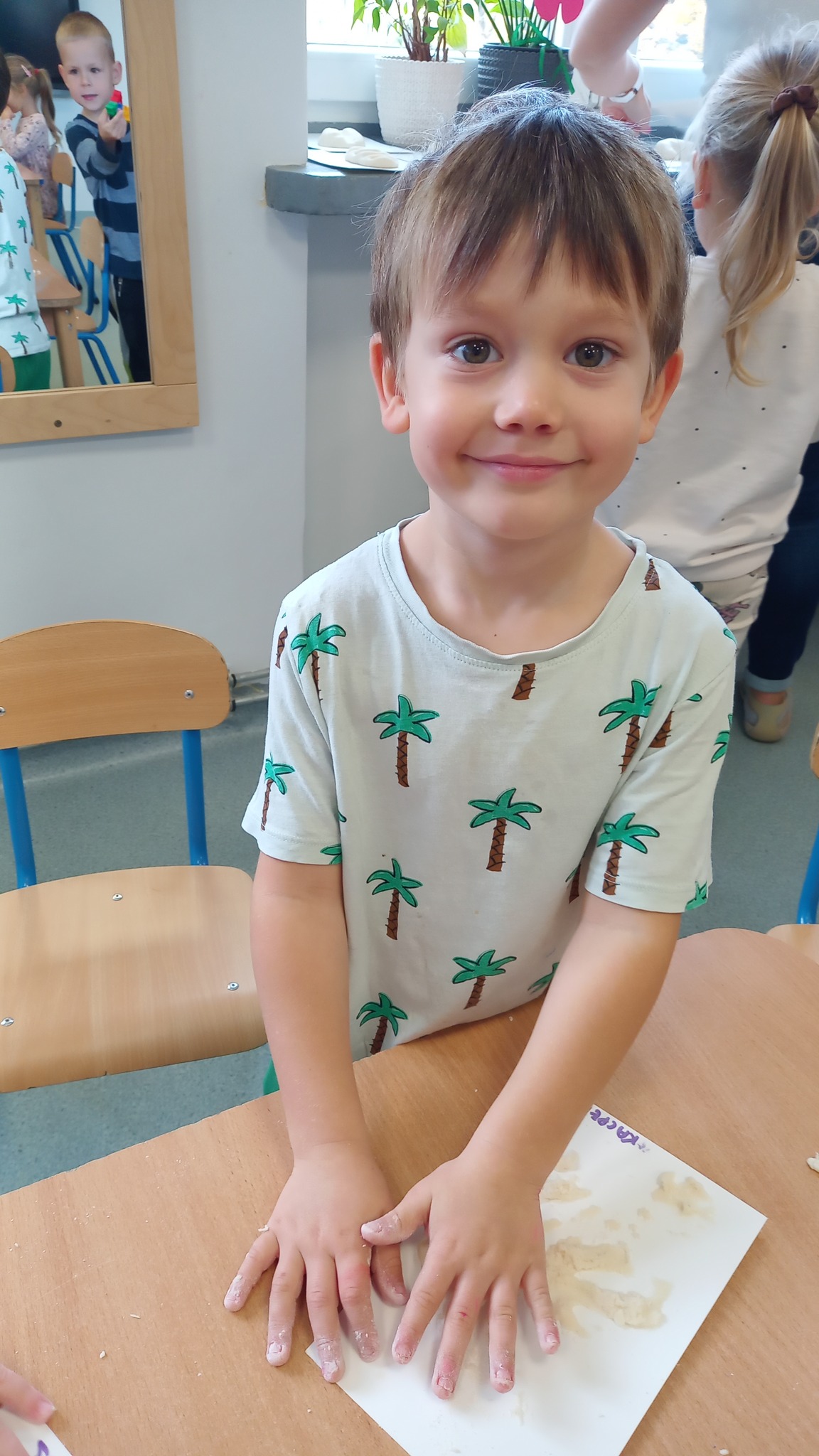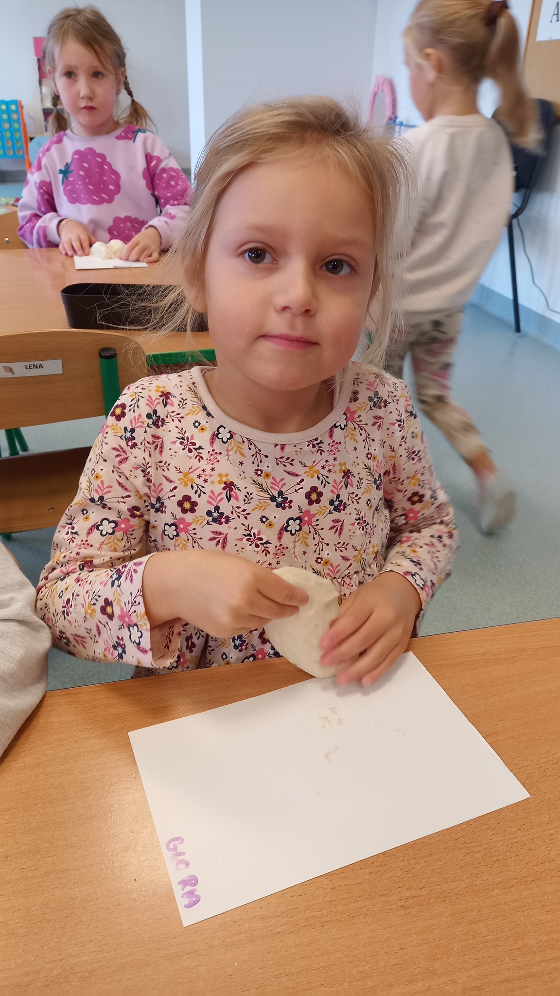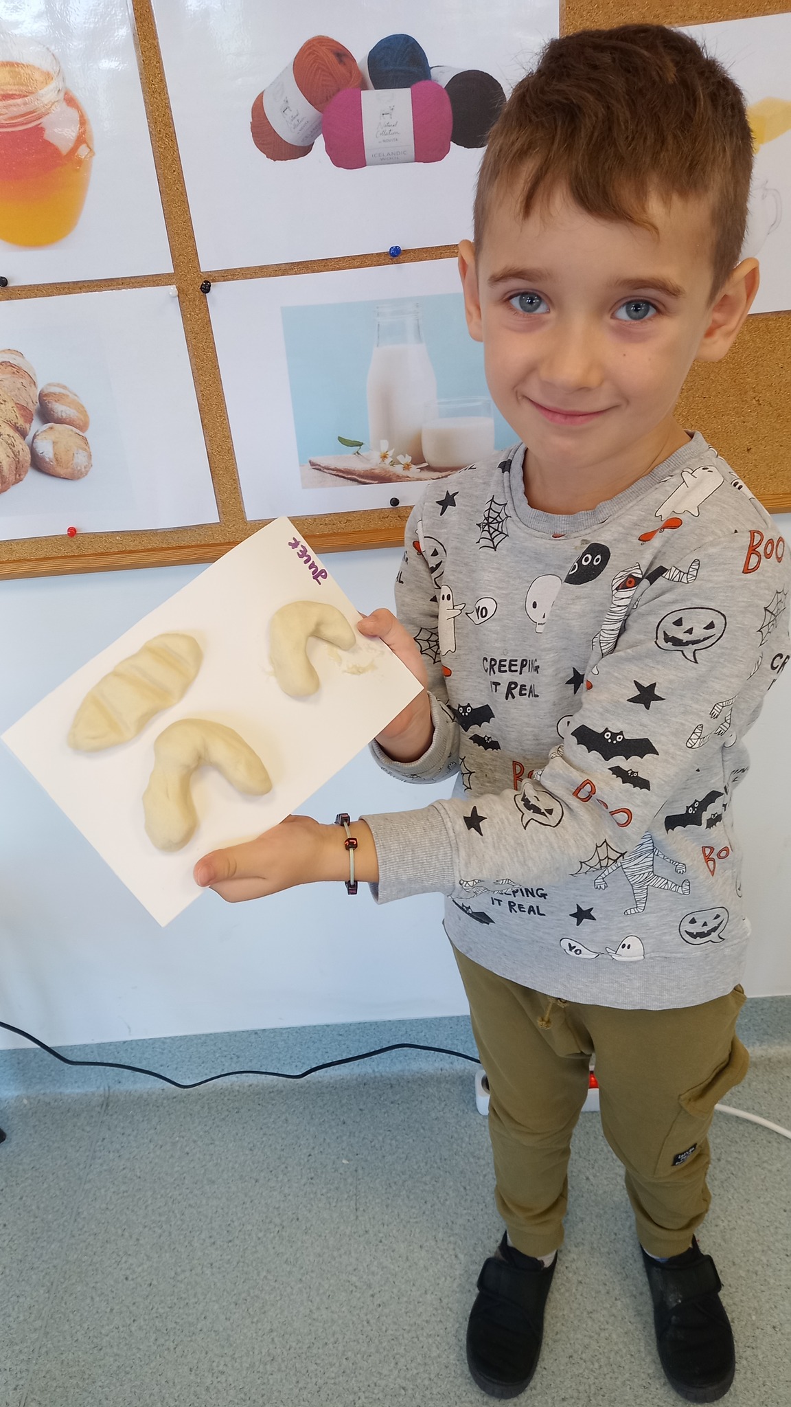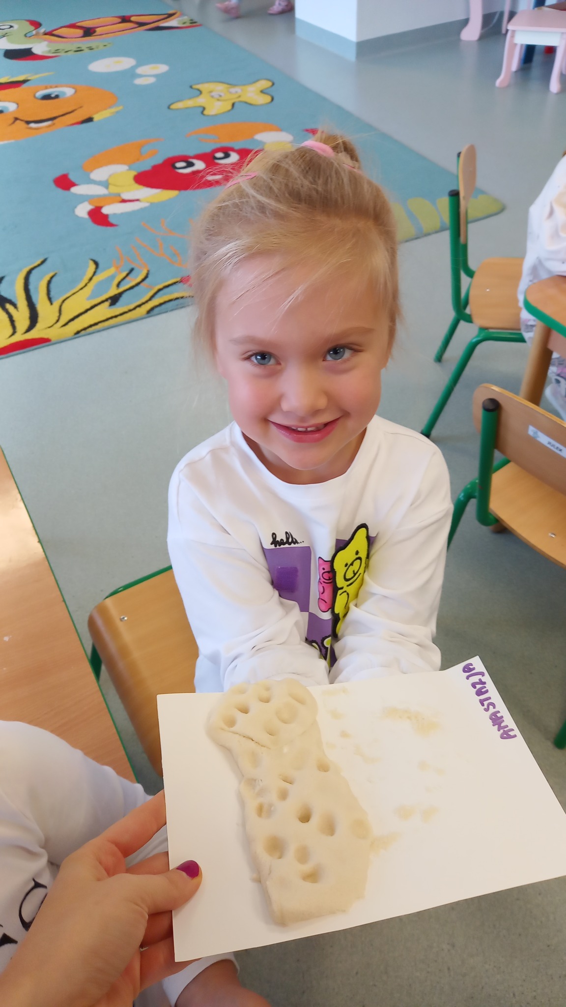 Zabawy sensoryczne z wykorzystaniem masy solnej. Dziś nasze Delfinki wcieliły się w rolę piekarzy i uformowały z masy bułeczki i rogaliki.