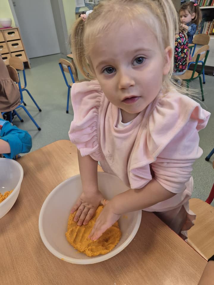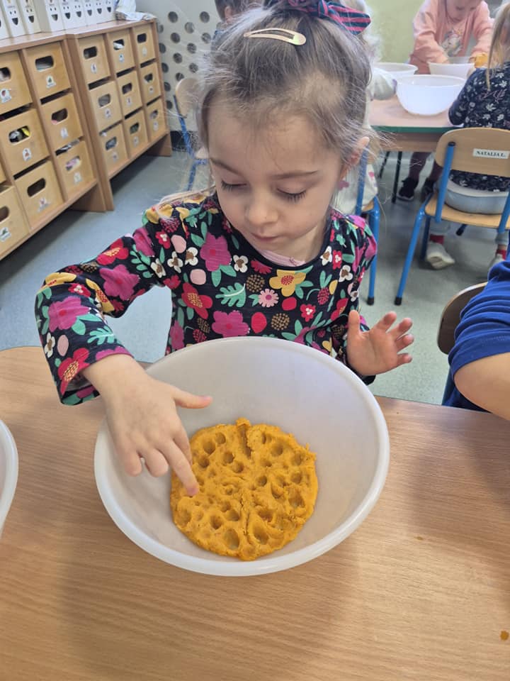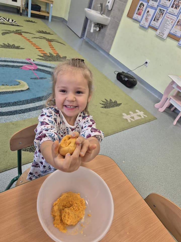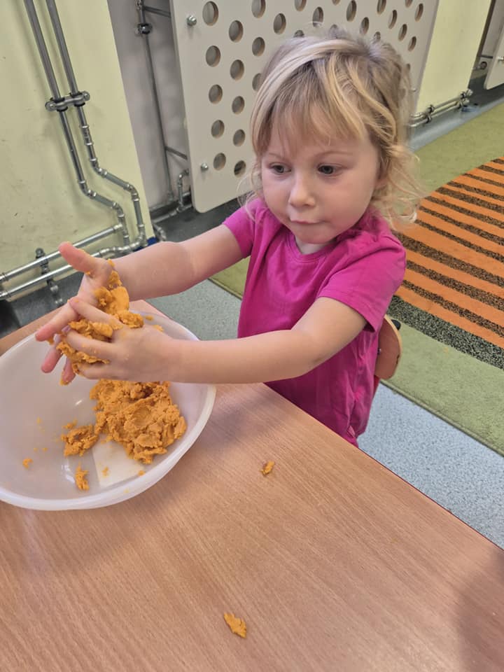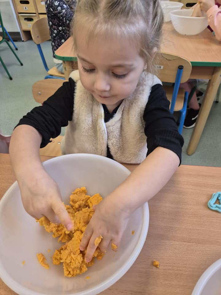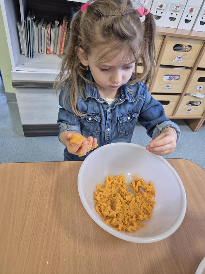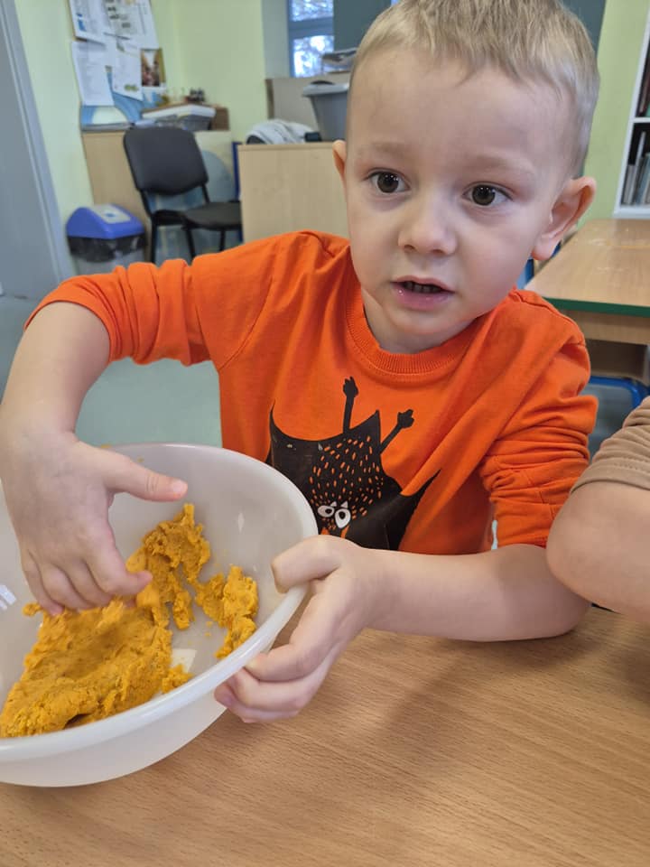 Zabawy sensoryczne masą marchewkową.