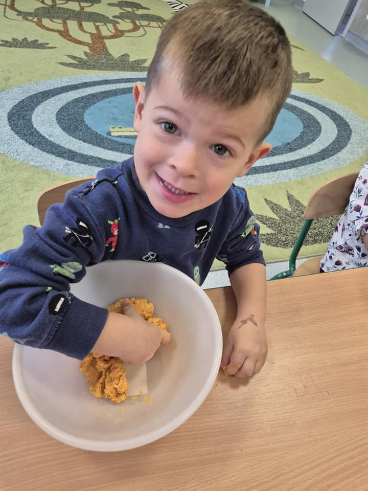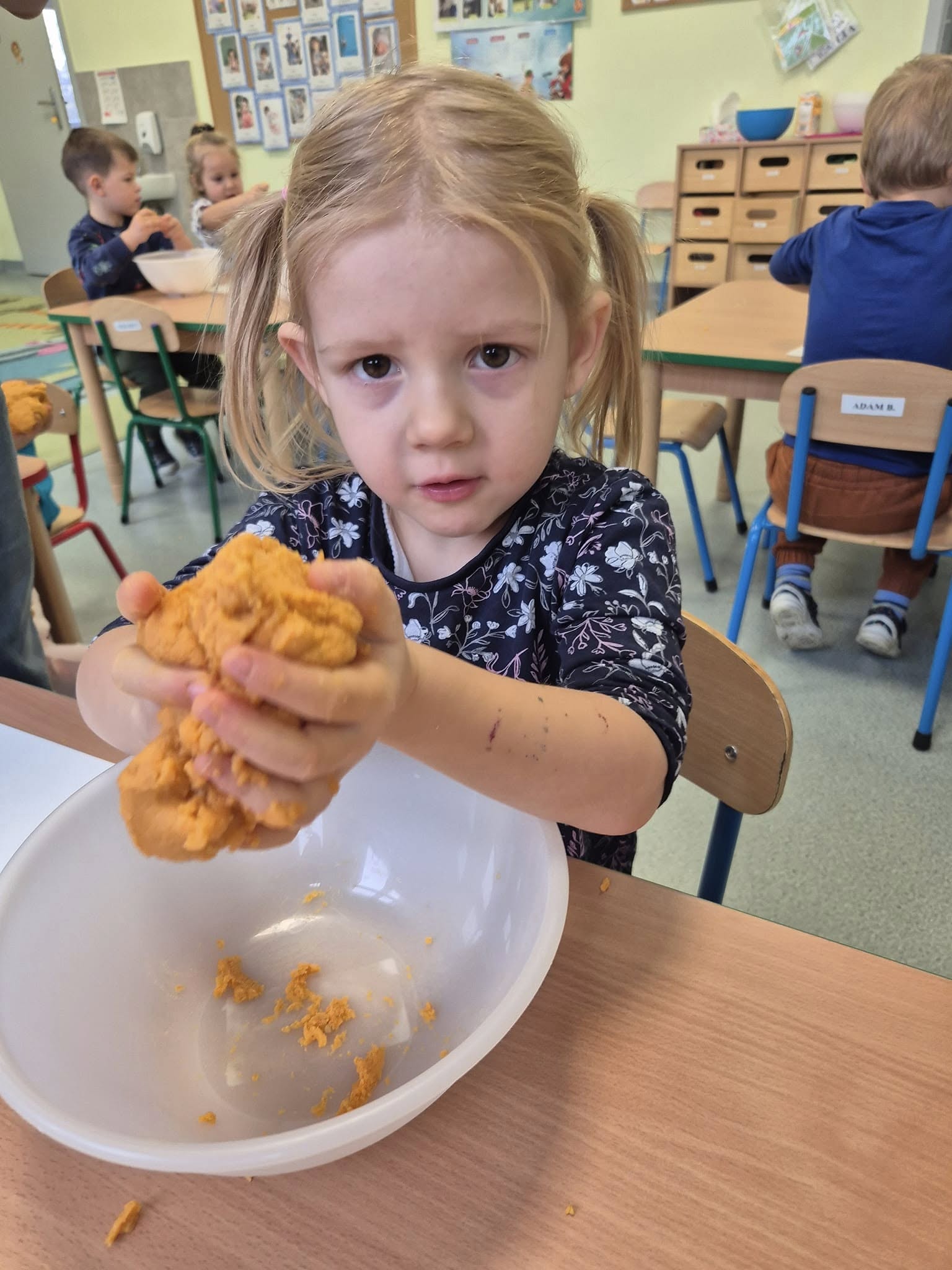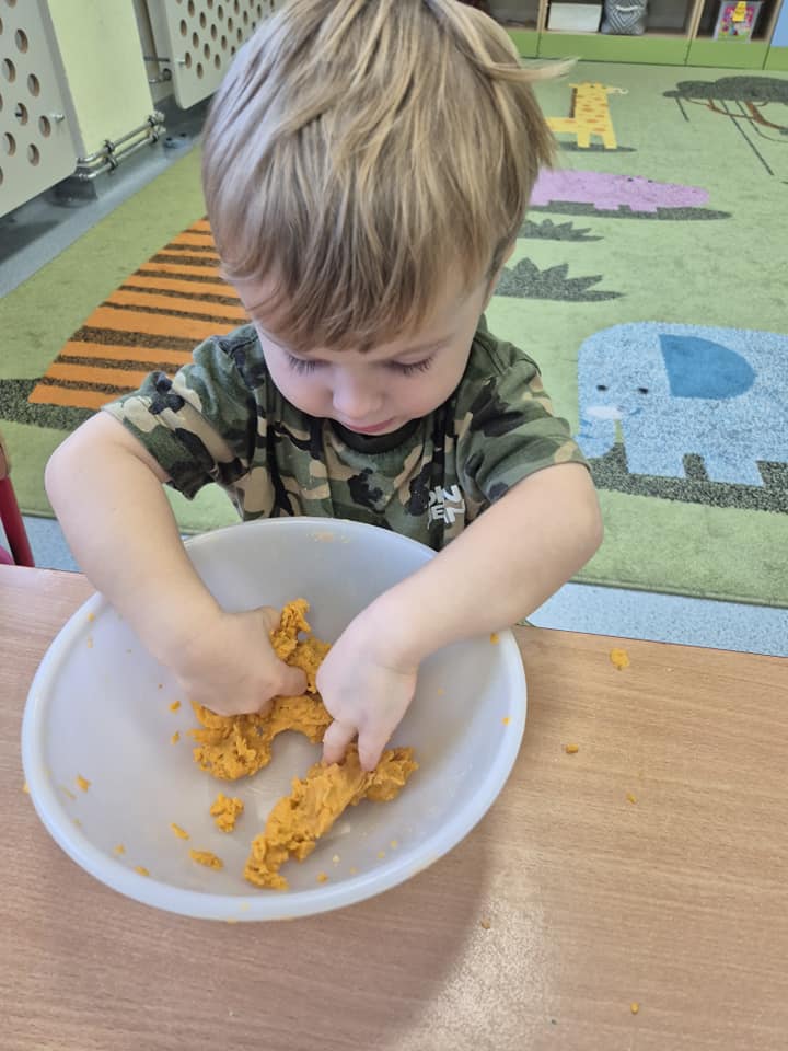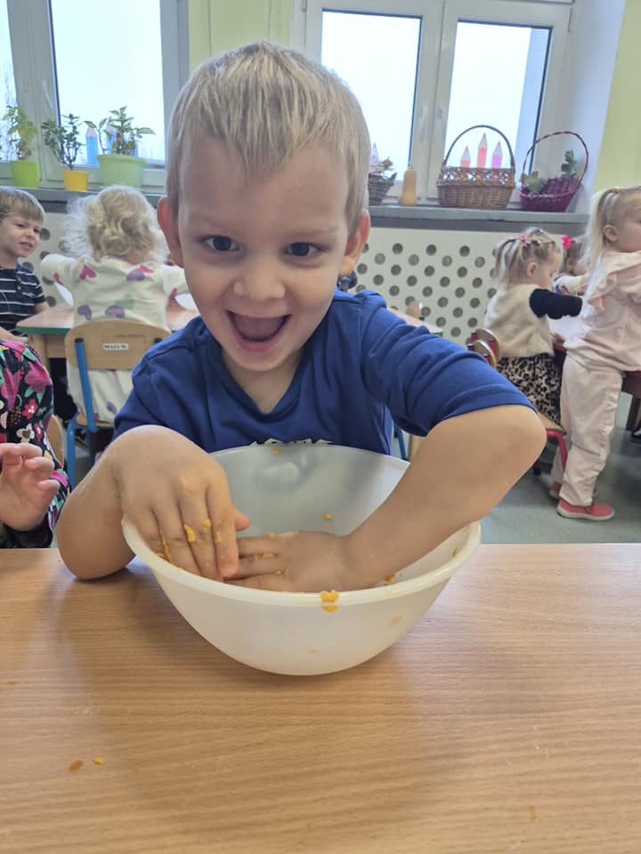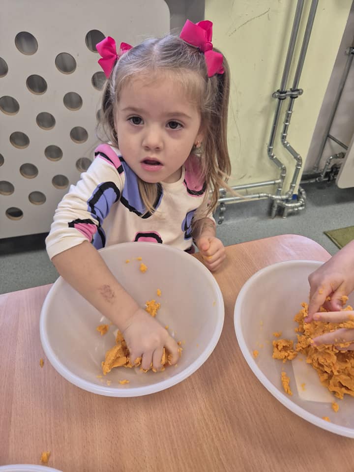 Zabawy sensoryczne masą marchewkową.