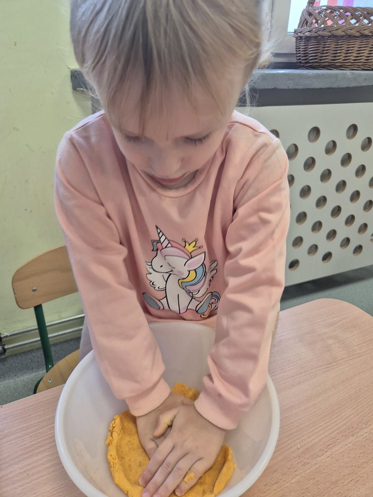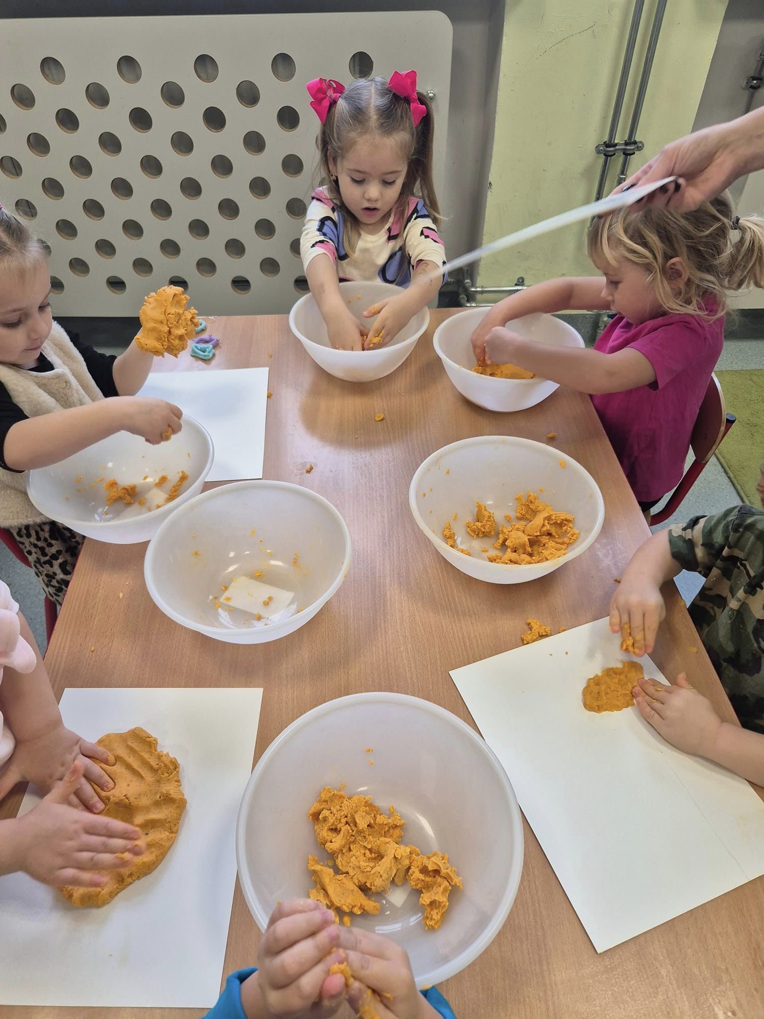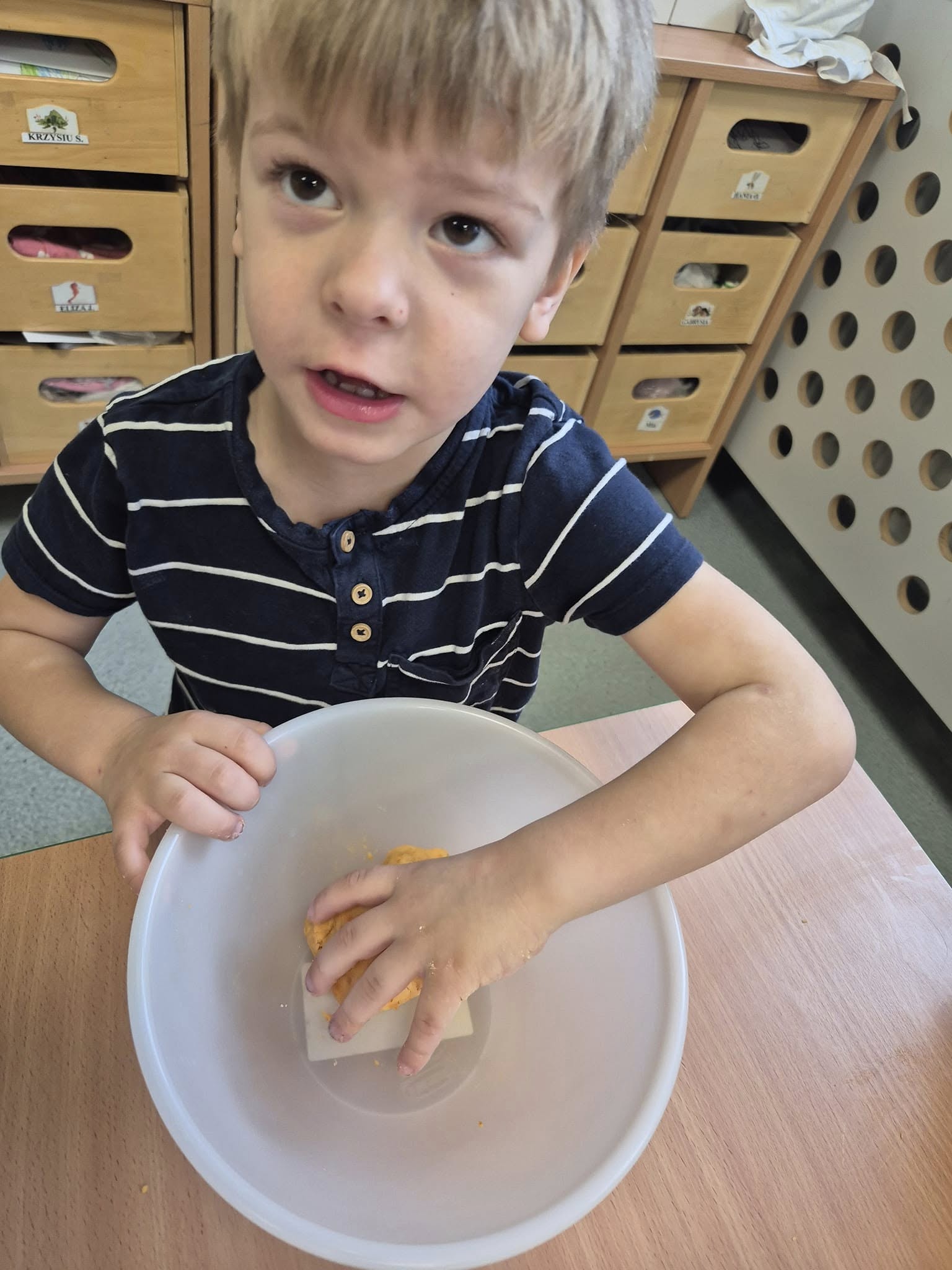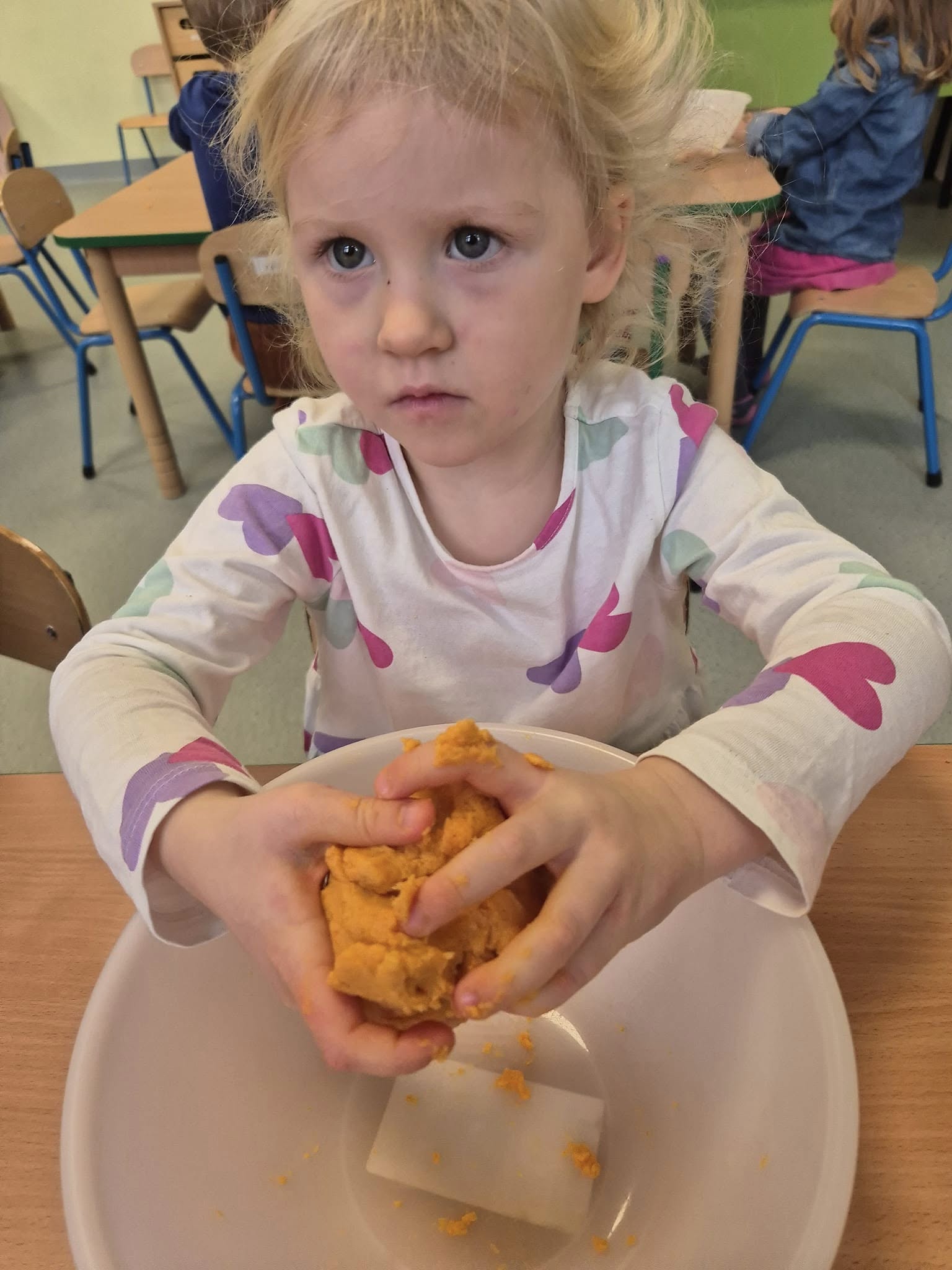 Zabawy sensoryczne masą marchewkową.