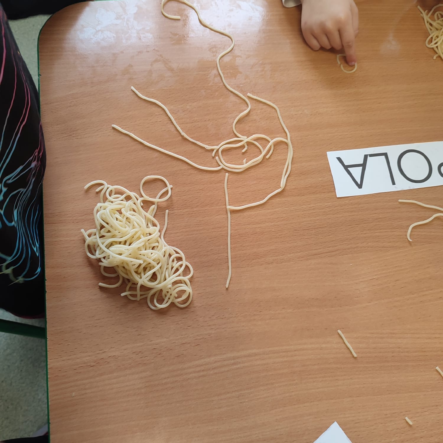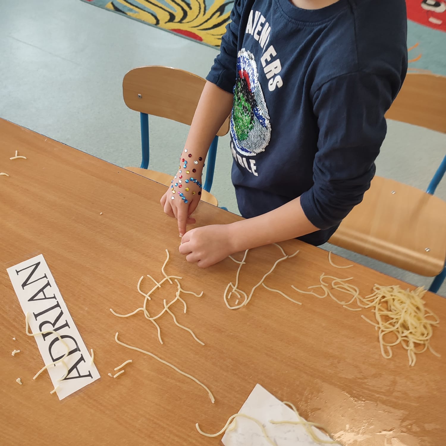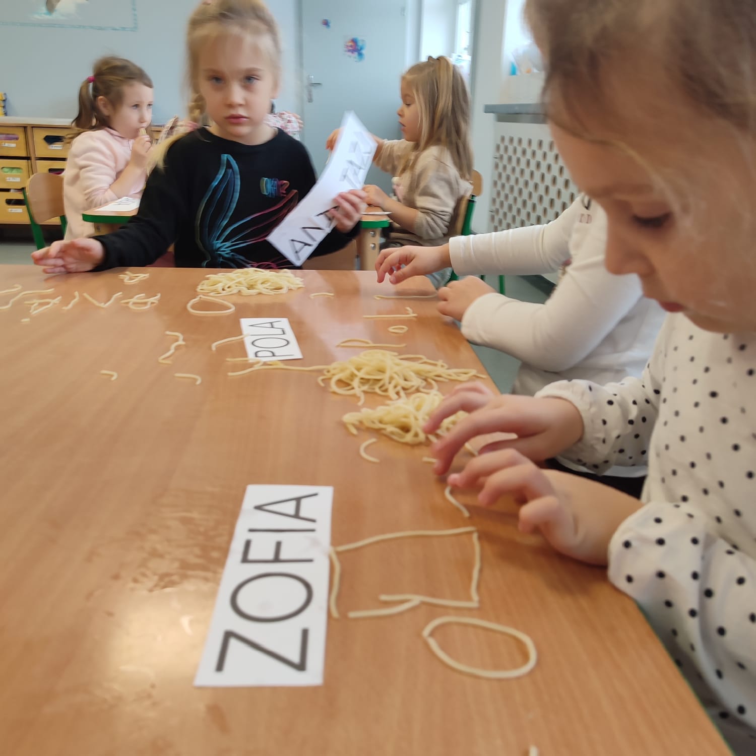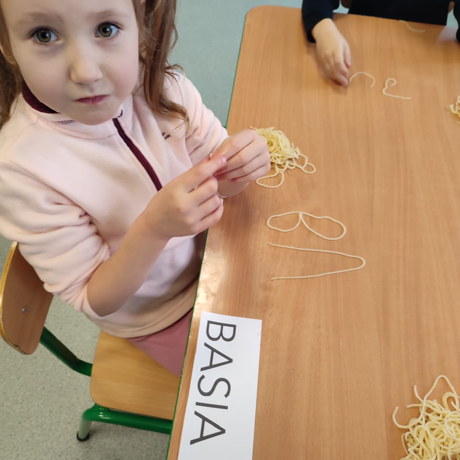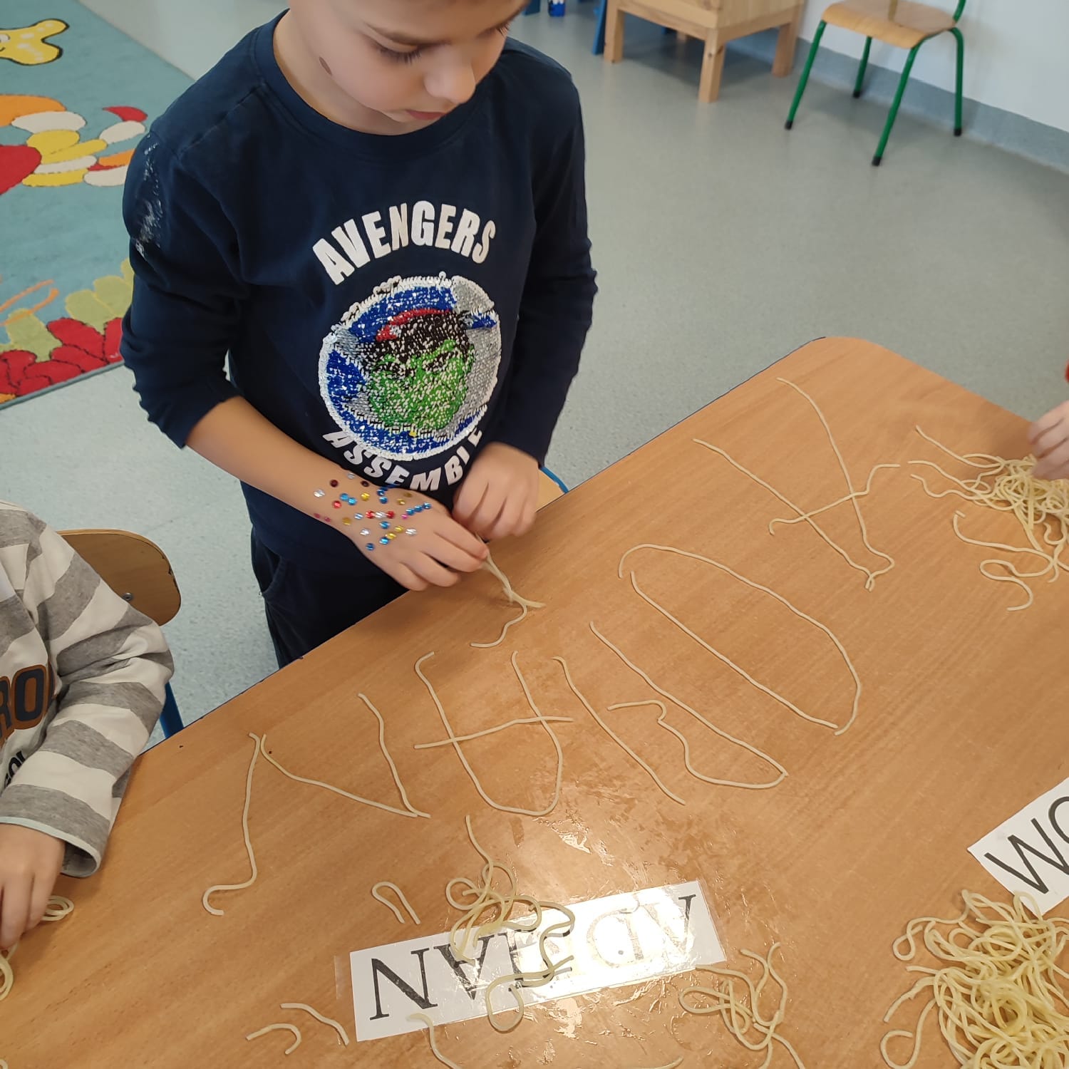 Zajęcia sensoryczne w grupie "Delfinki" z wykorzystaniem makaronu. Nasze przedszkolaki ćwiczyły pisanie liter poprzez zabawę. Dzieci stworzyły również ciekawe makaronowe stworki.
