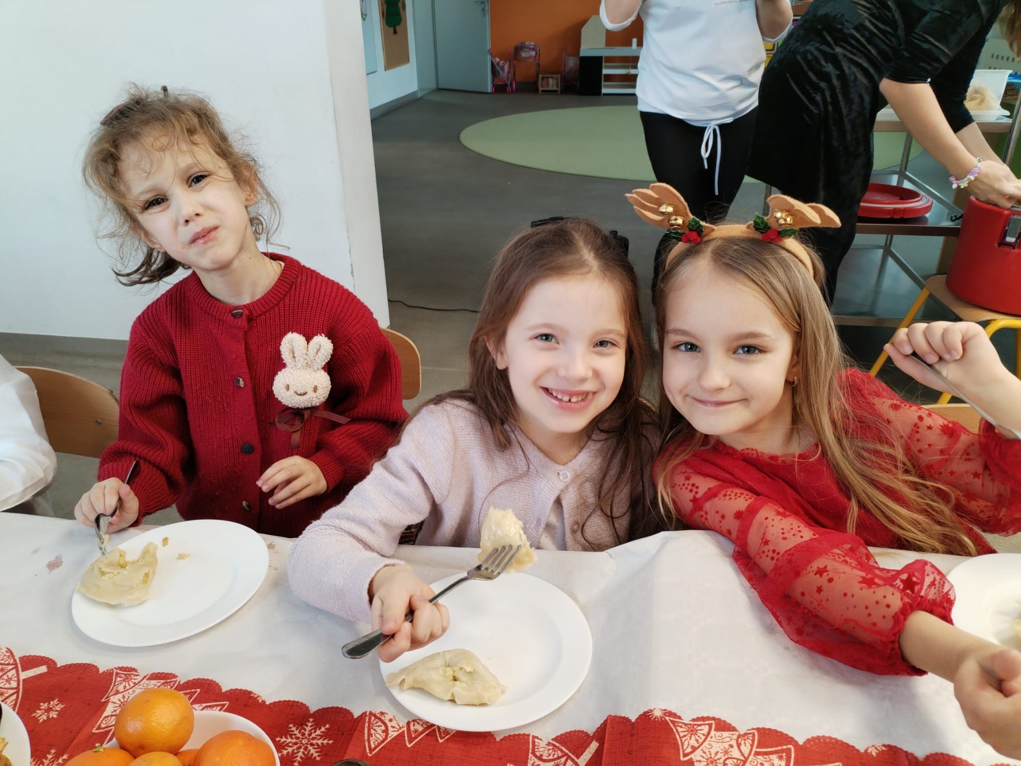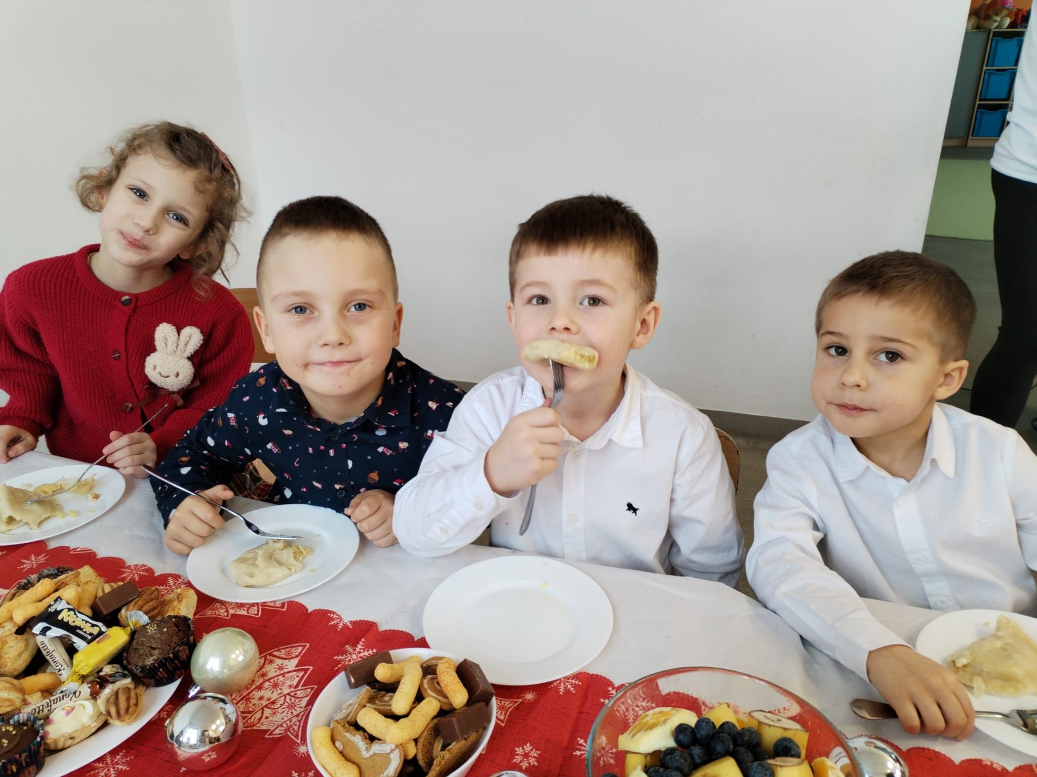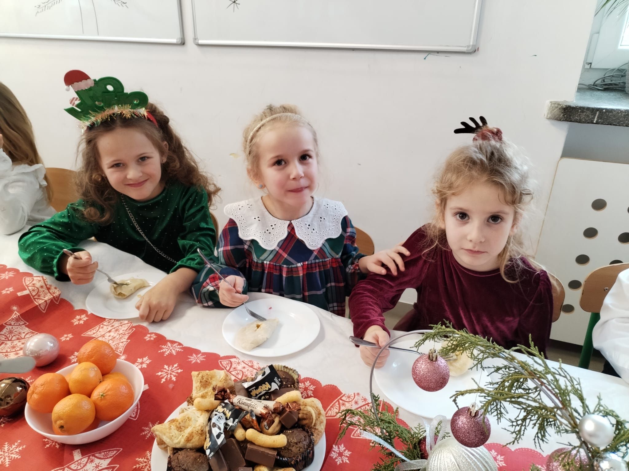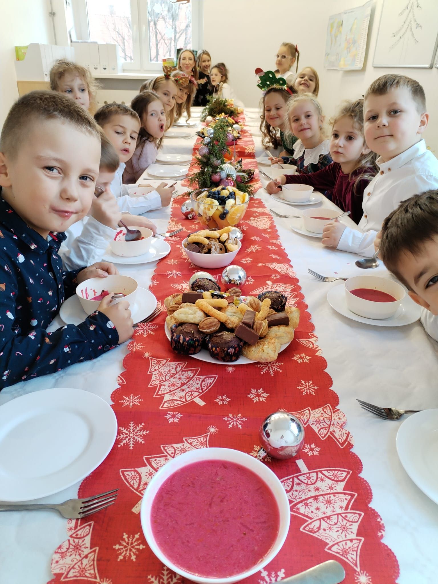 Wczoraj w naszym przedszkolu wszyscy wspólnie przy jednym stole zjedliśmy świąteczny obiad. Były kolędy, rozmowy, śmiechy I świąteczna atmosfera.