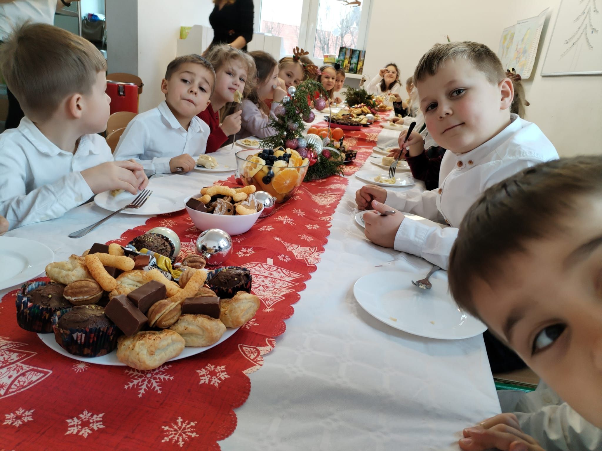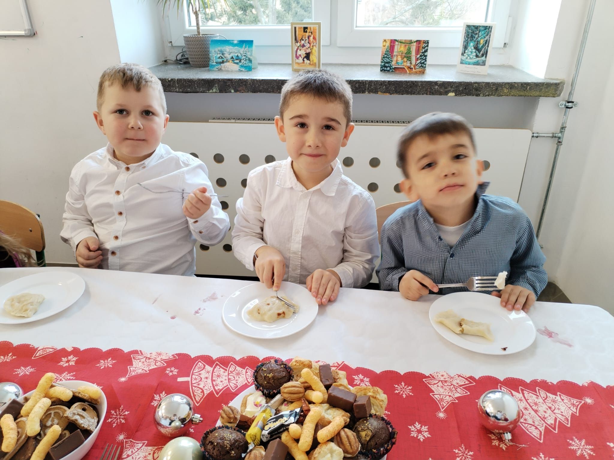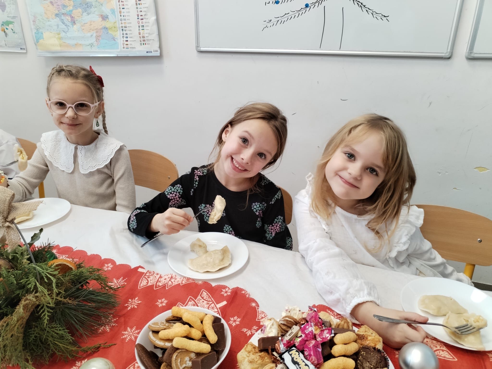 Wczoraj w naszym przedszkolu wszyscy wspólnie przy jednym stole zjedliśmy świąteczny obiad. Były kolędy, rozmowy, śmiechy I świąteczna atmosfera.