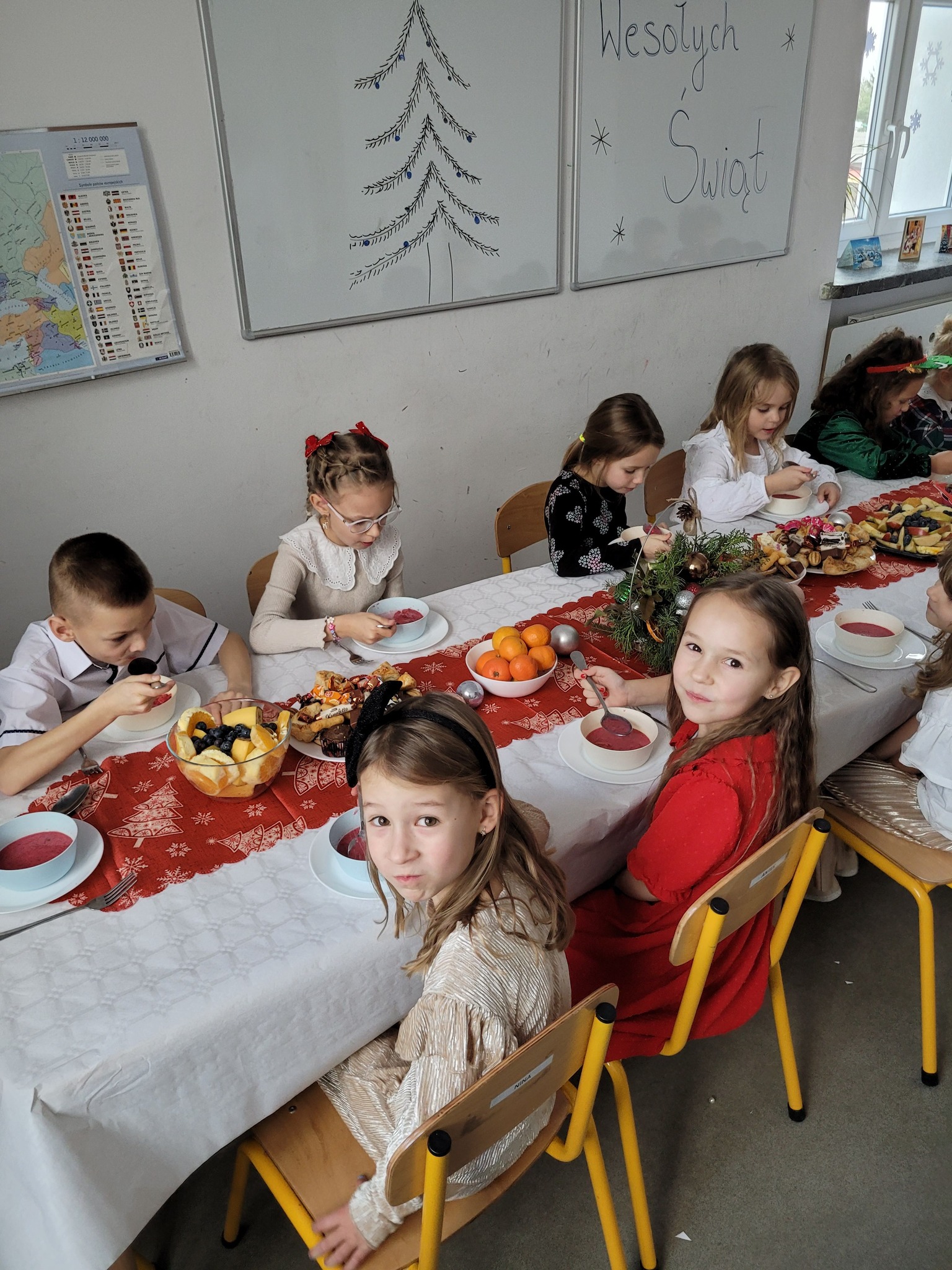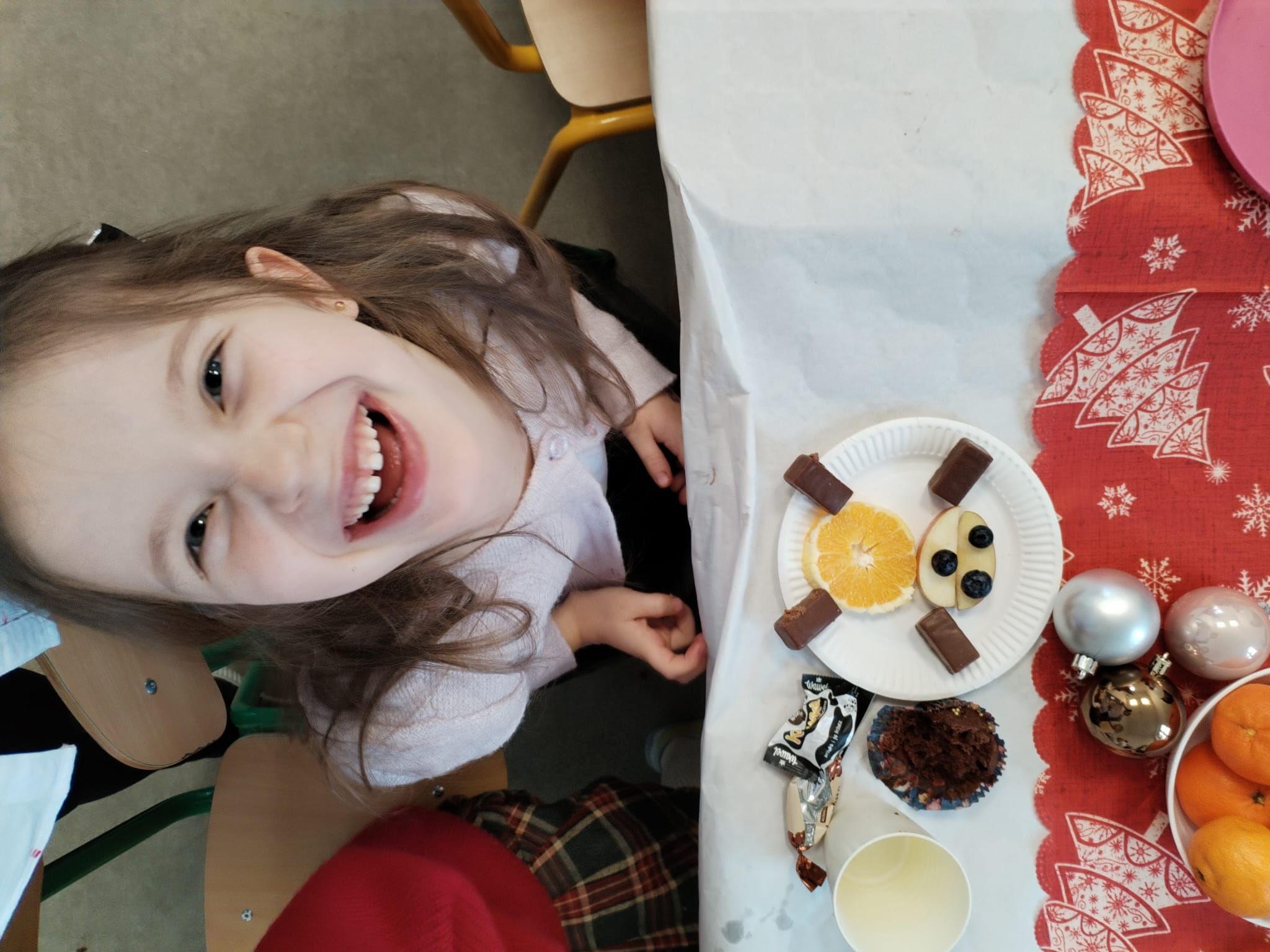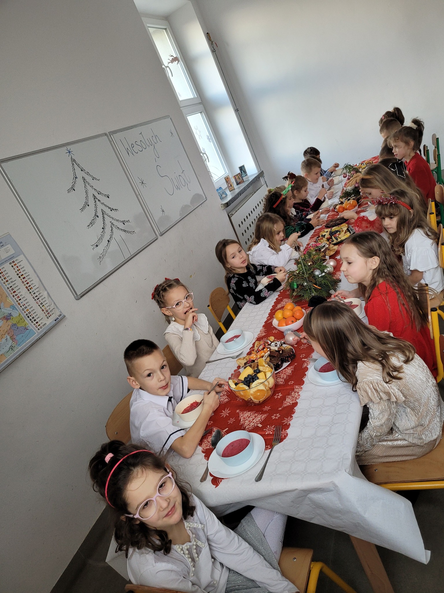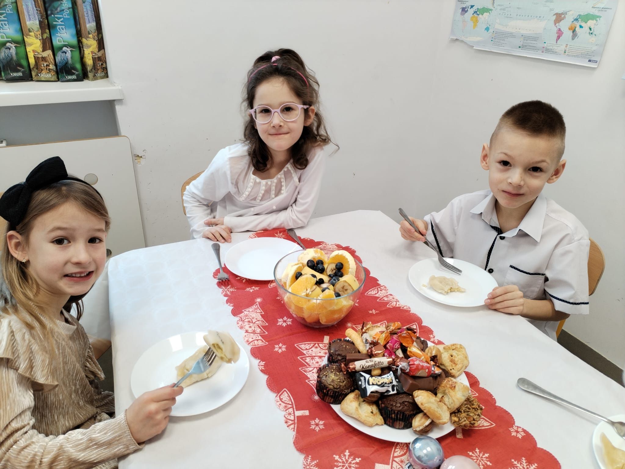 Wczoraj w naszym przedszkolu wszyscy wspólnie przy jednym stole zjedliśmy świąteczny obiad. Były kolędy, rozmowy, śmiechy I świąteczna atmosfera.