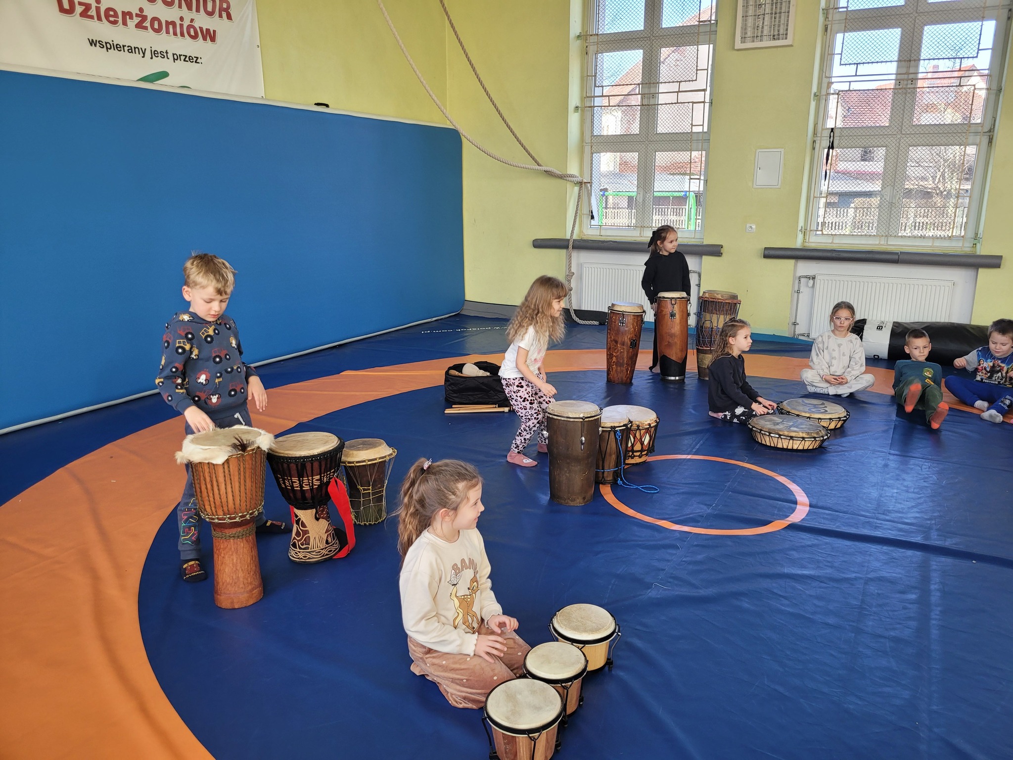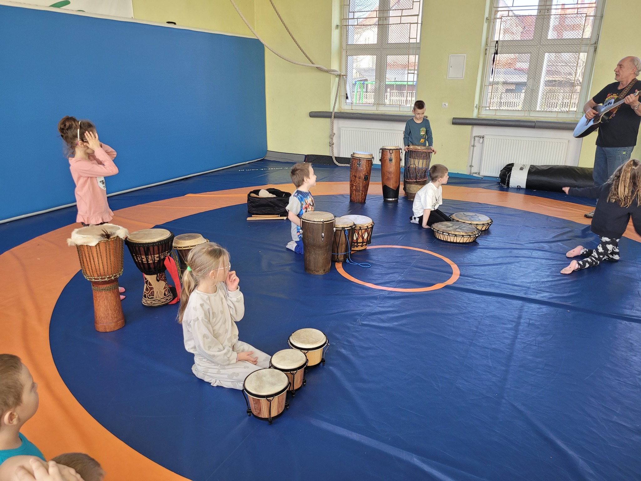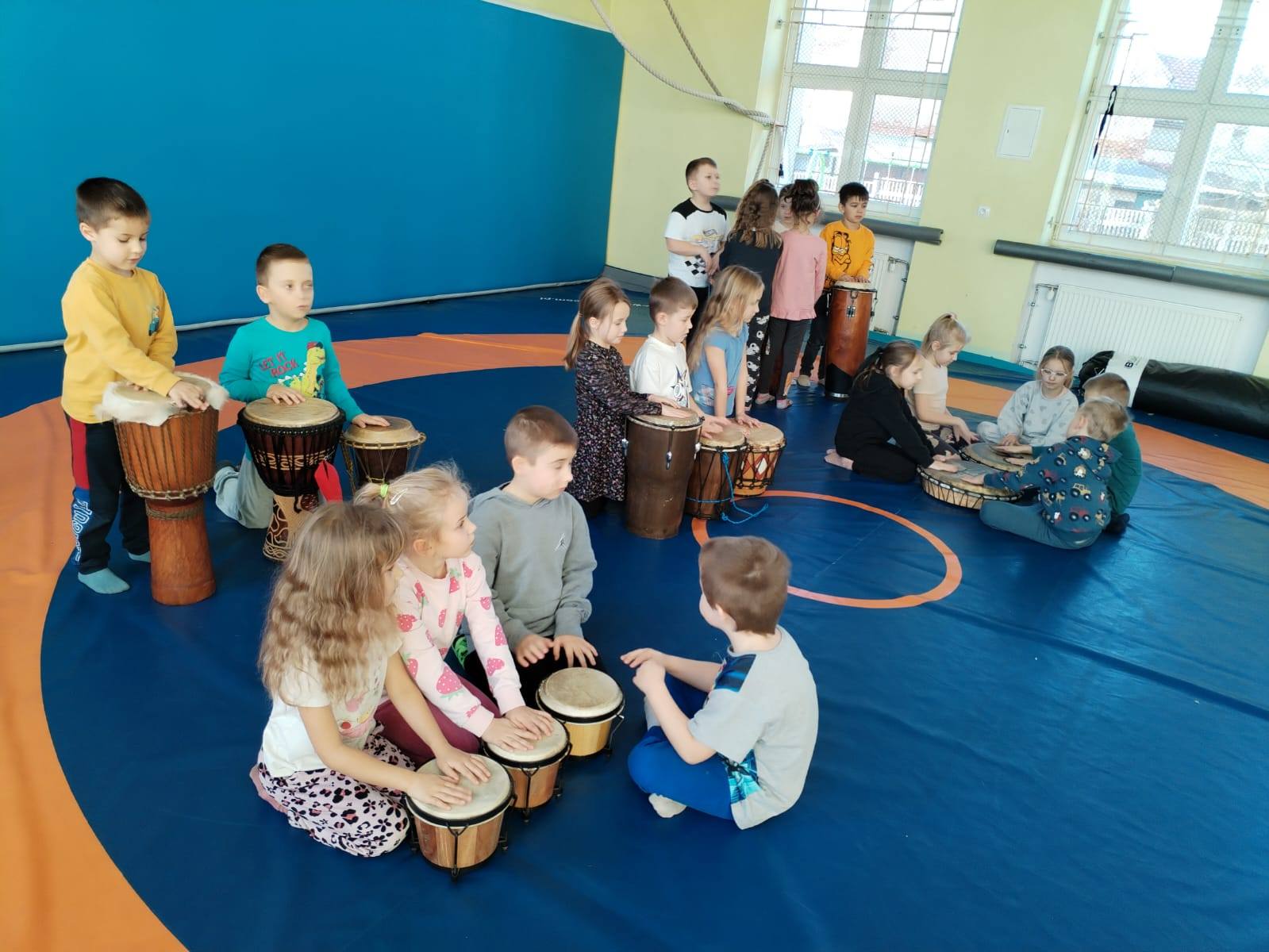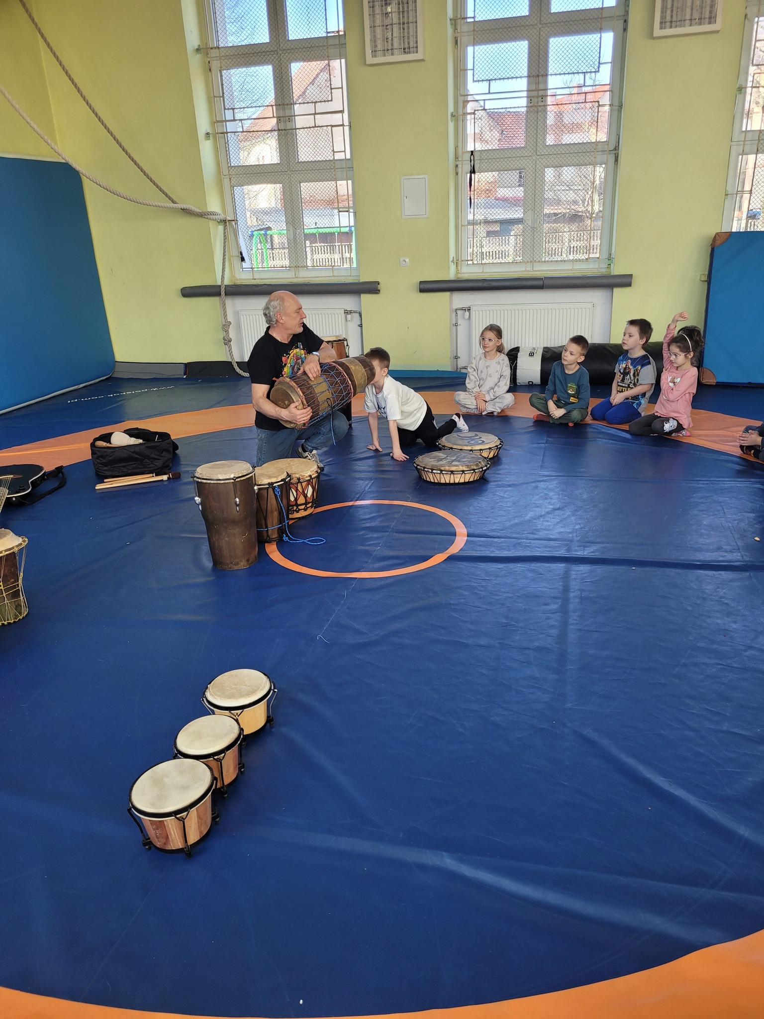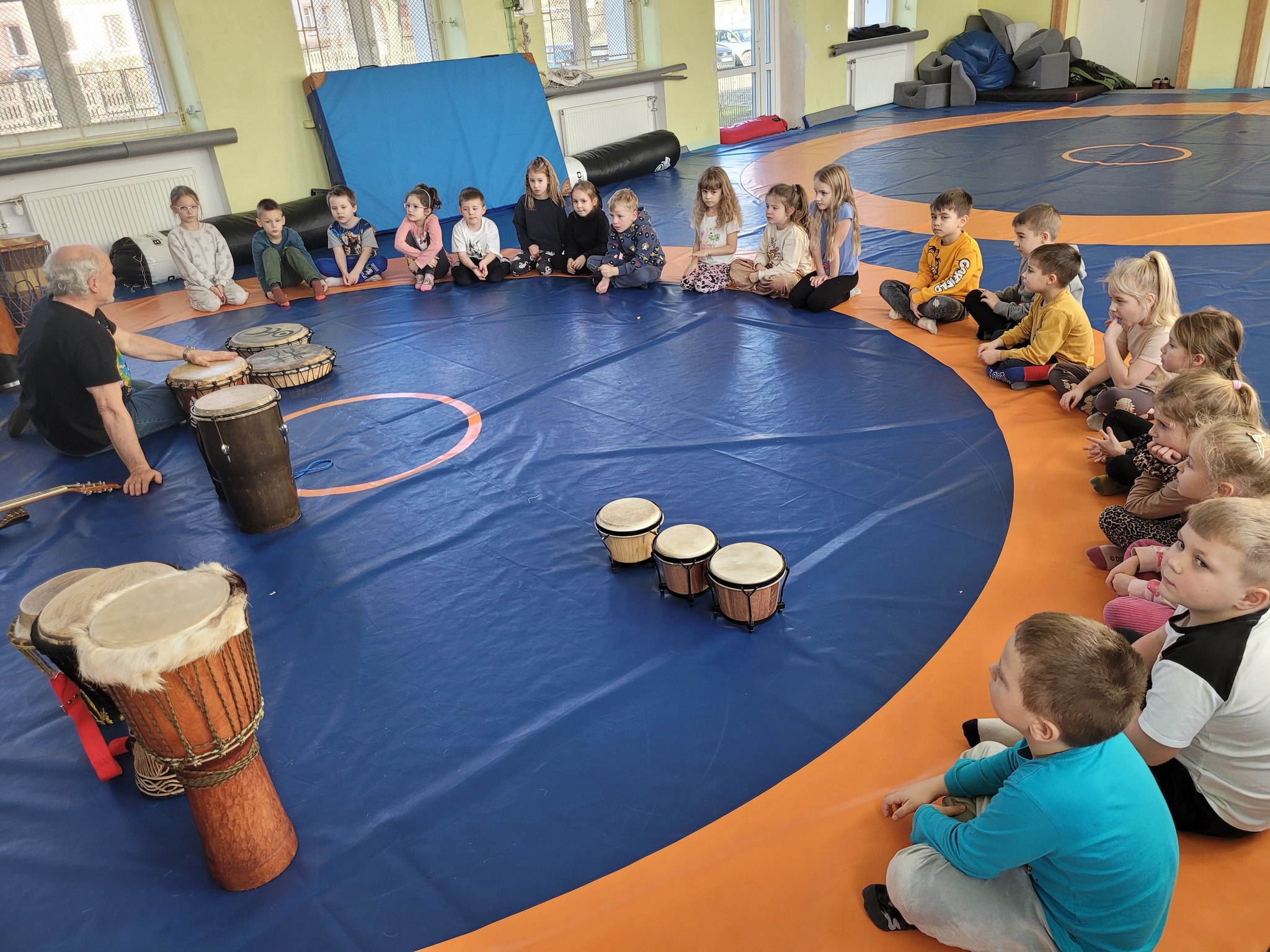 Zajęcia muzyczne z Panem Zbyszkiem z Akademia Dźwięku i Ciszy PADMA zawsze wywołują w dzieciach wiele pozytywnych emocji. Tym razem głównym punktem programu były bębny. Jednak na zajęciach muzycznych dzieci ćwiczyły również pamięć słuchową oraz wystukiwanie rytmów.