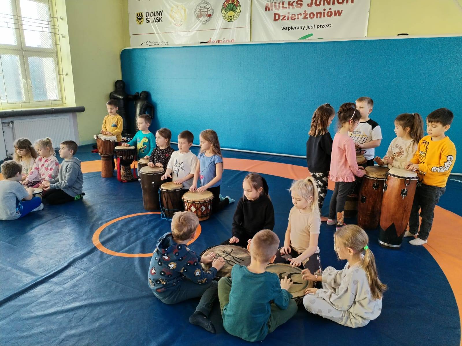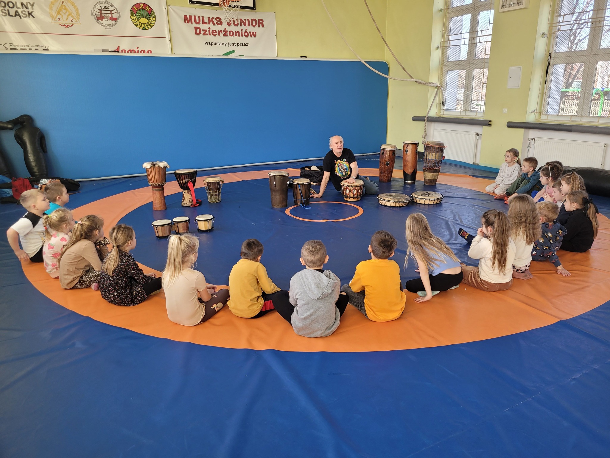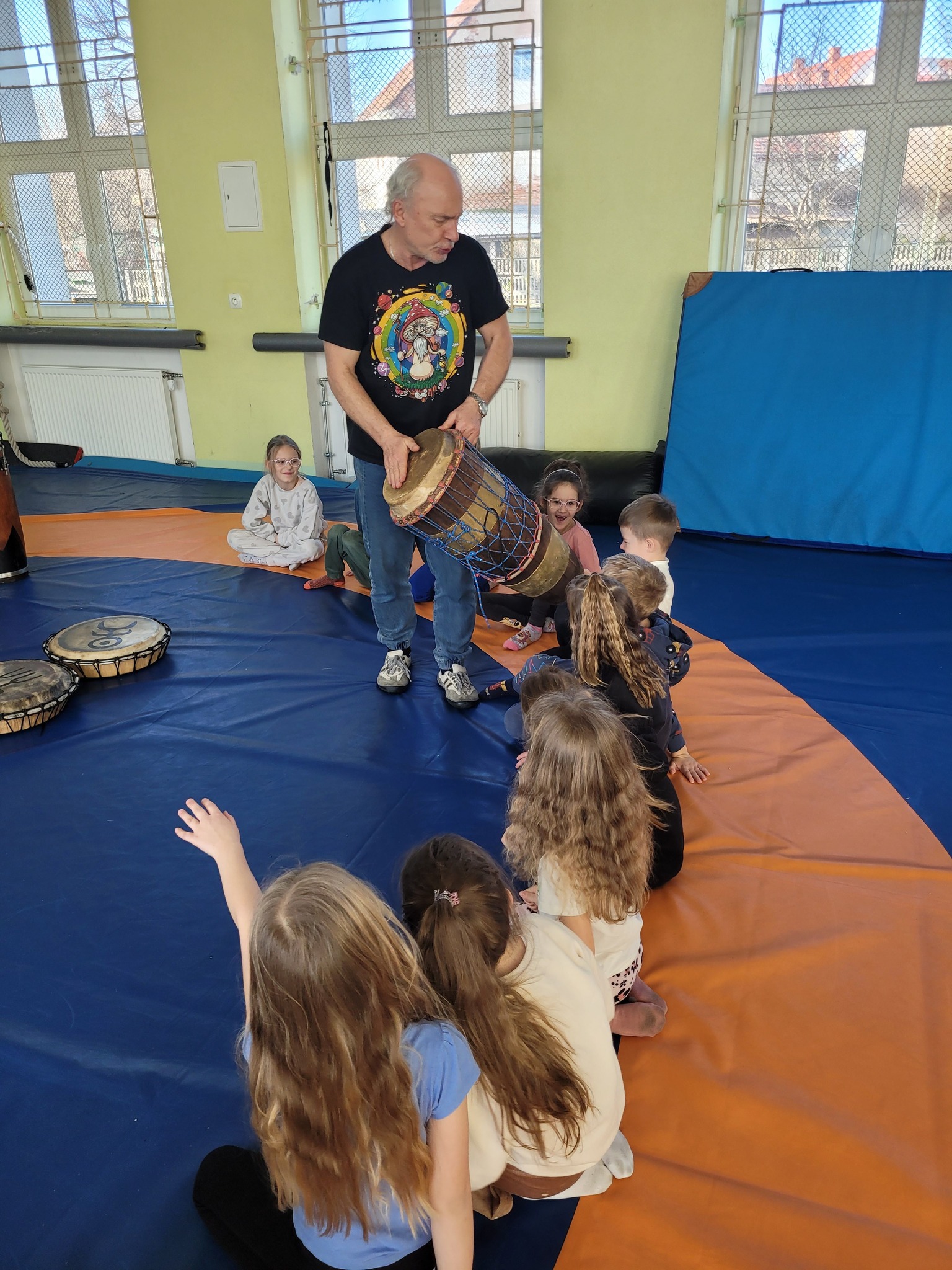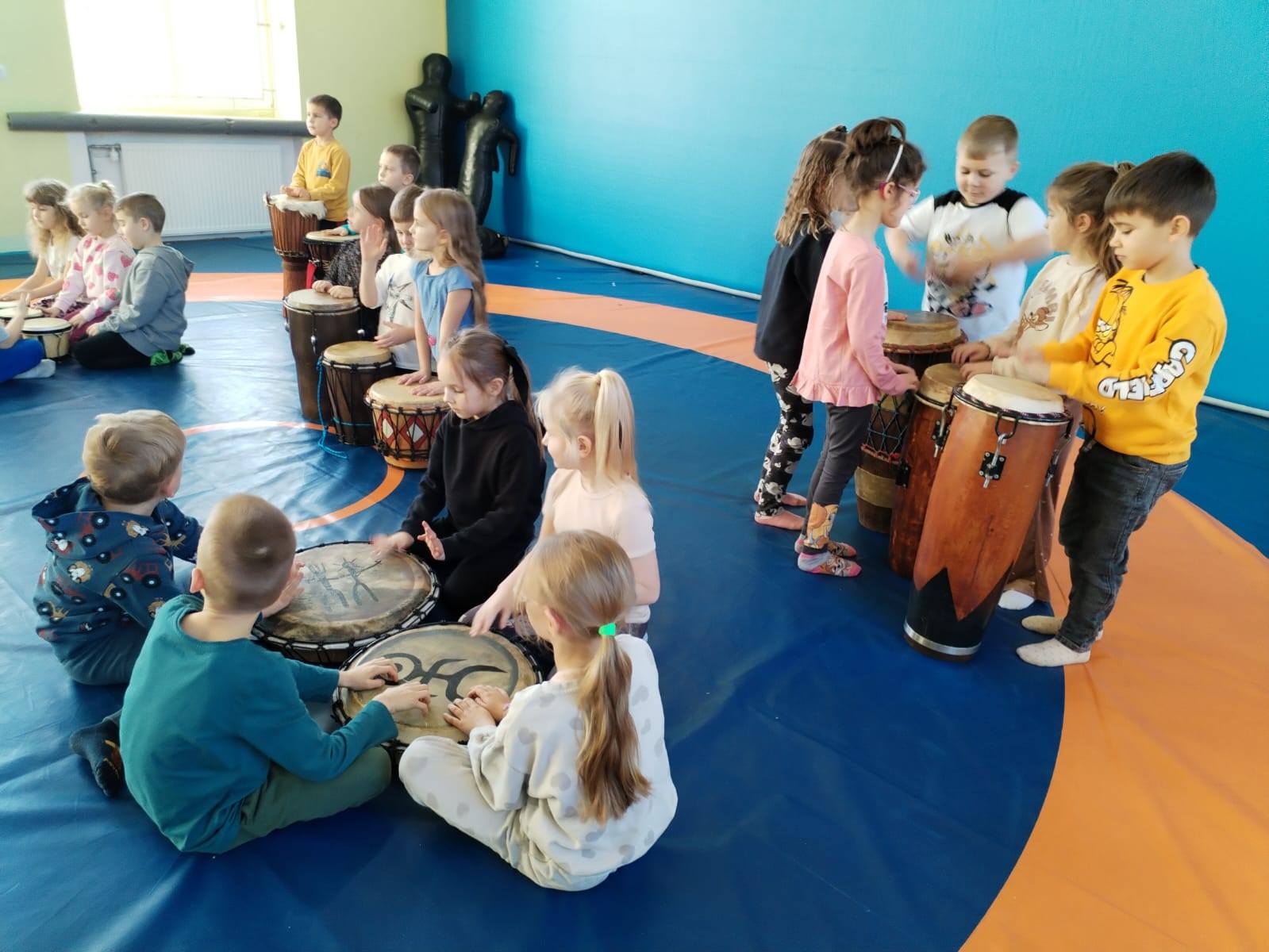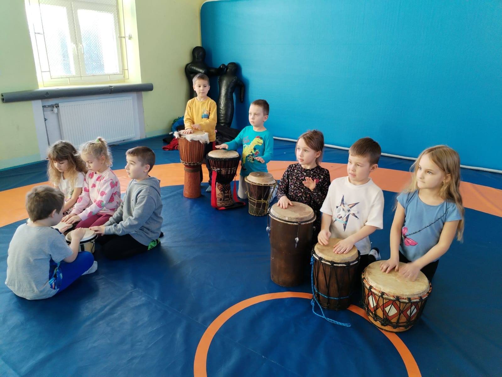 Zajęcia muzyczne z Panem Zbyszkiem z Akademia Dźwięku i Ciszy PADMA zawsze wywołują w dzieciach wiele pozytywnych emocji. Tym razem głównym punktem programu były bębny. Jednak na zajęciach muzycznych dzieci ćwiczyły również pamięć słuchową oraz wystukiwanie rytmów.