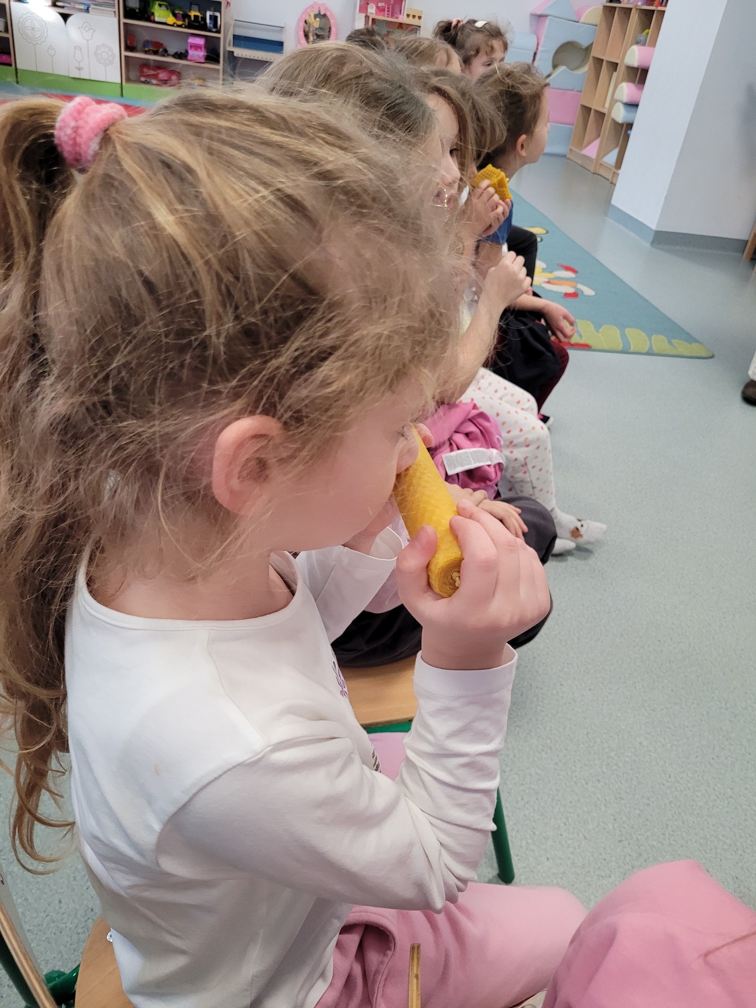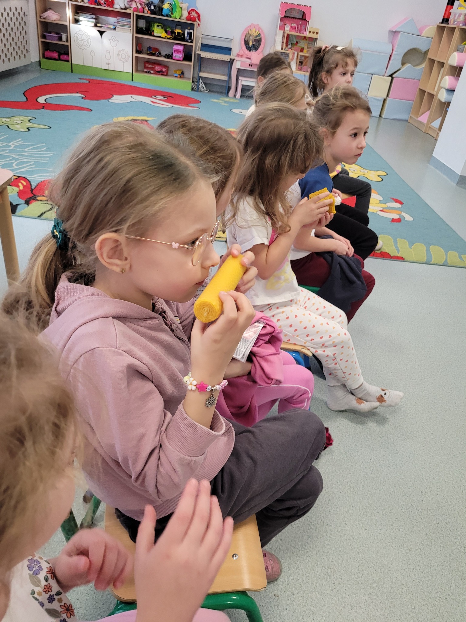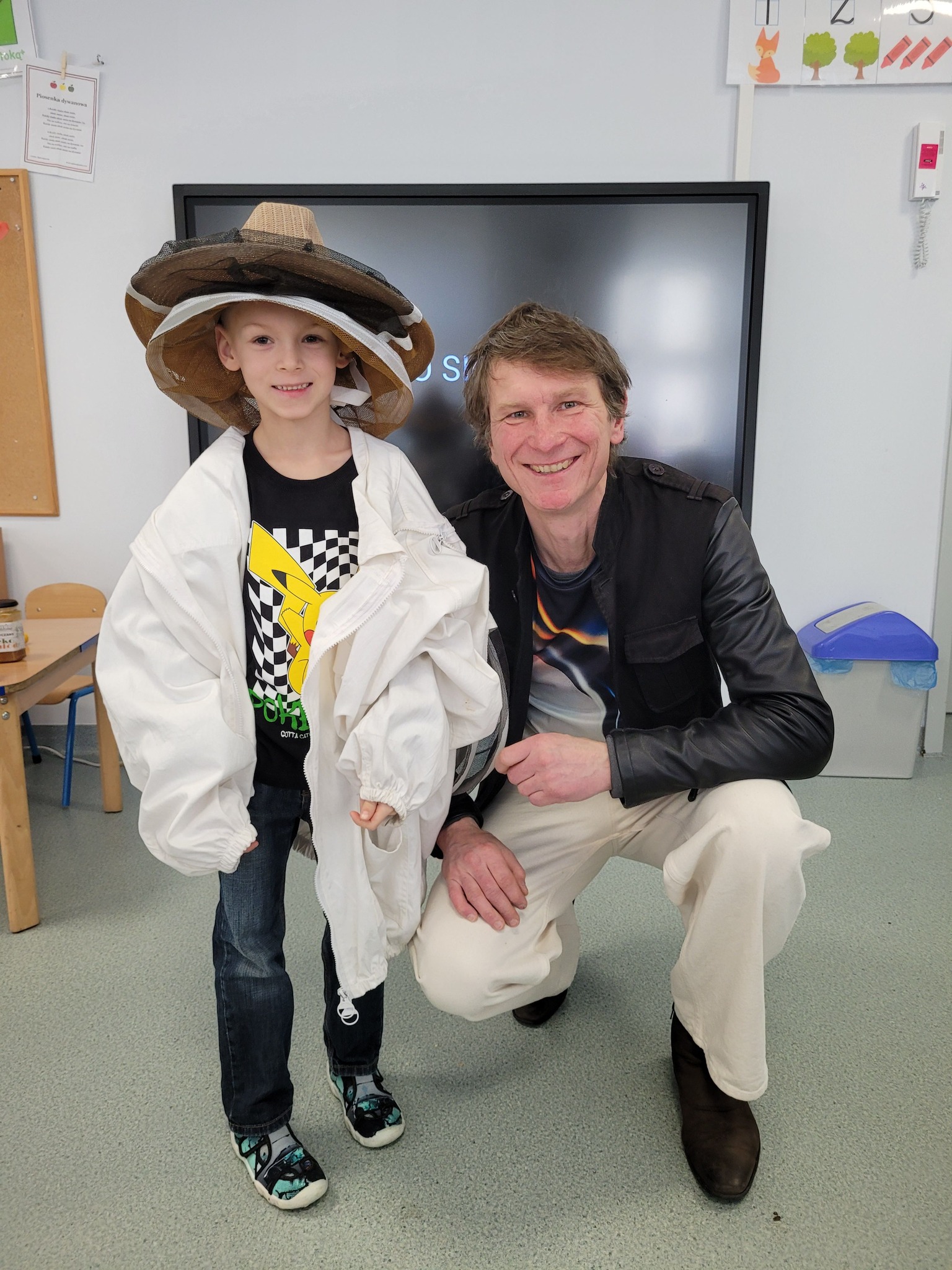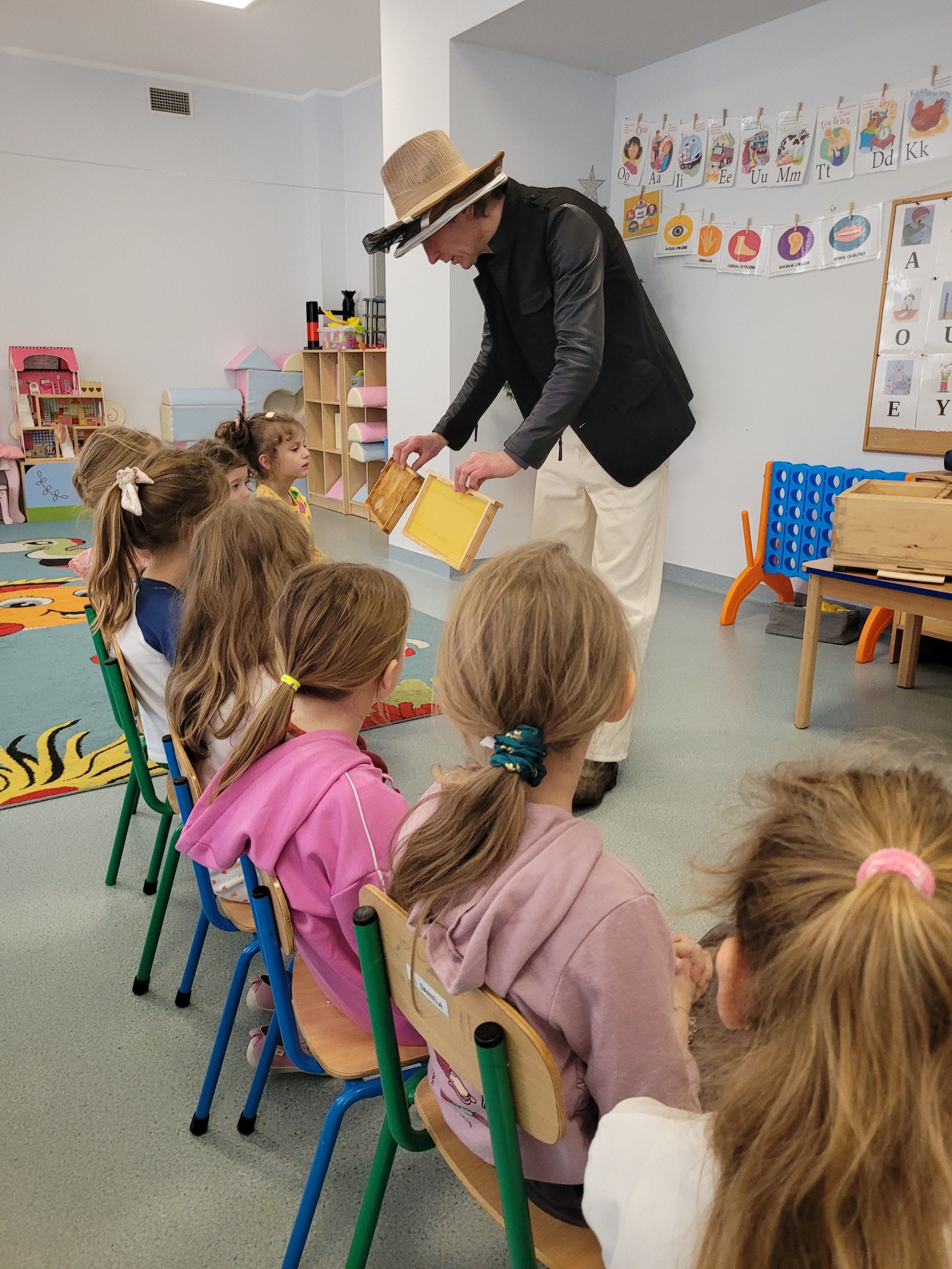 Do naszego przedszkola zawitał wyjątkowy gość. Pan Jacek przybliżył dzieciom pracę pszczelarza. Przedszkolaki dowiedziały się w jaki sposób powstaje miód, jaką rolę pełnią pszczoły zarówno w ulu, jak i dla przyrody i człowieka oraz wielu innych ciekawostek.