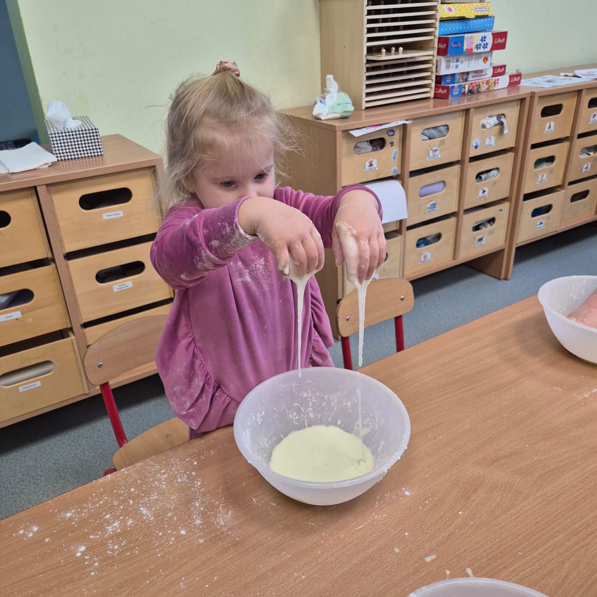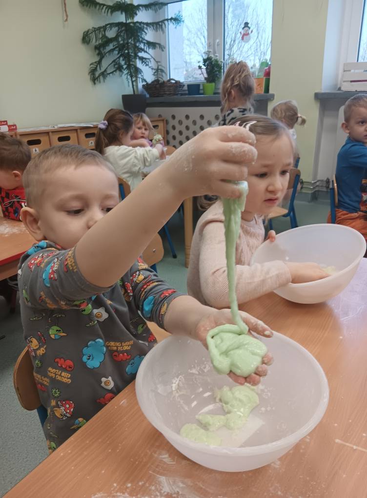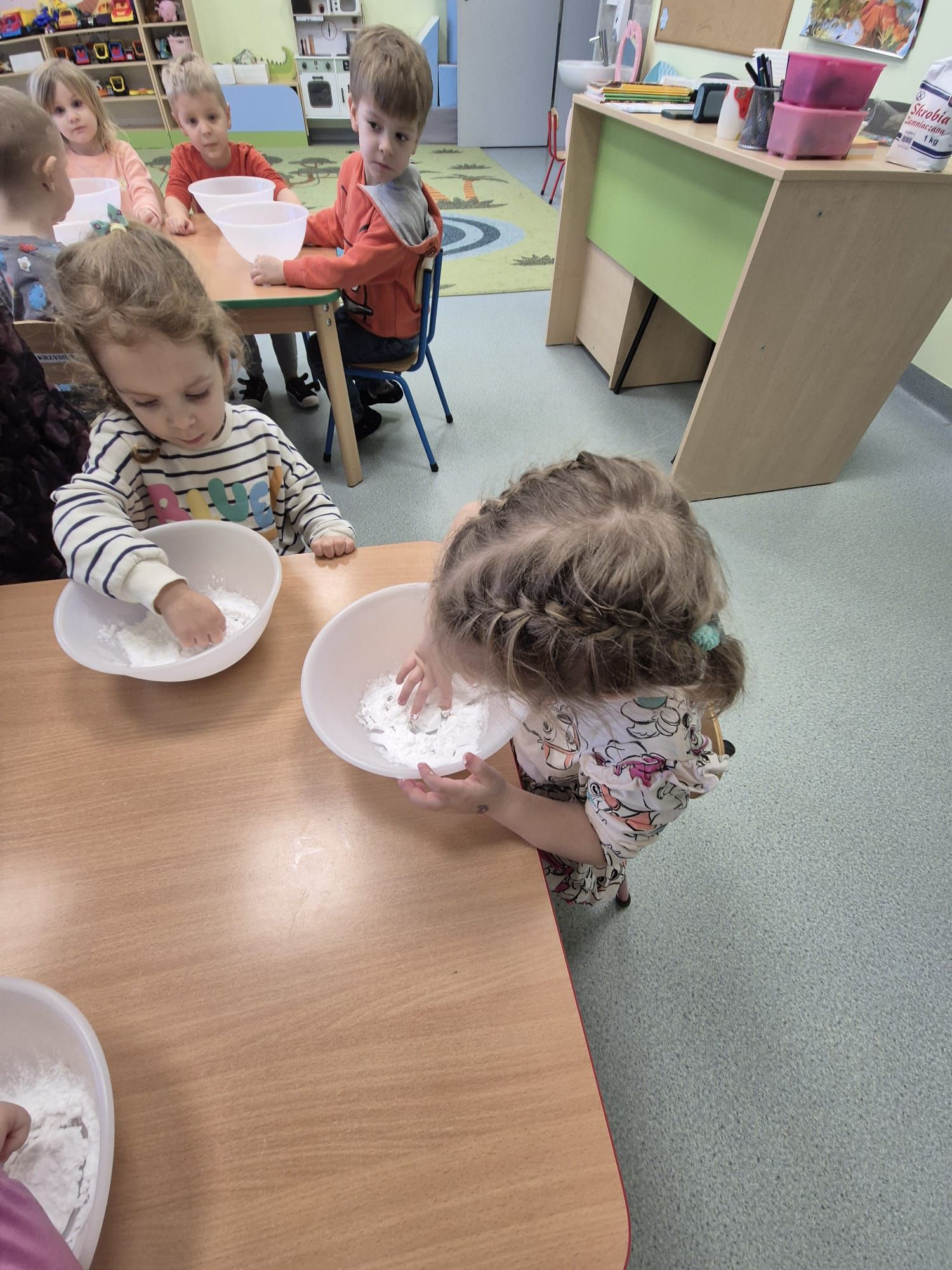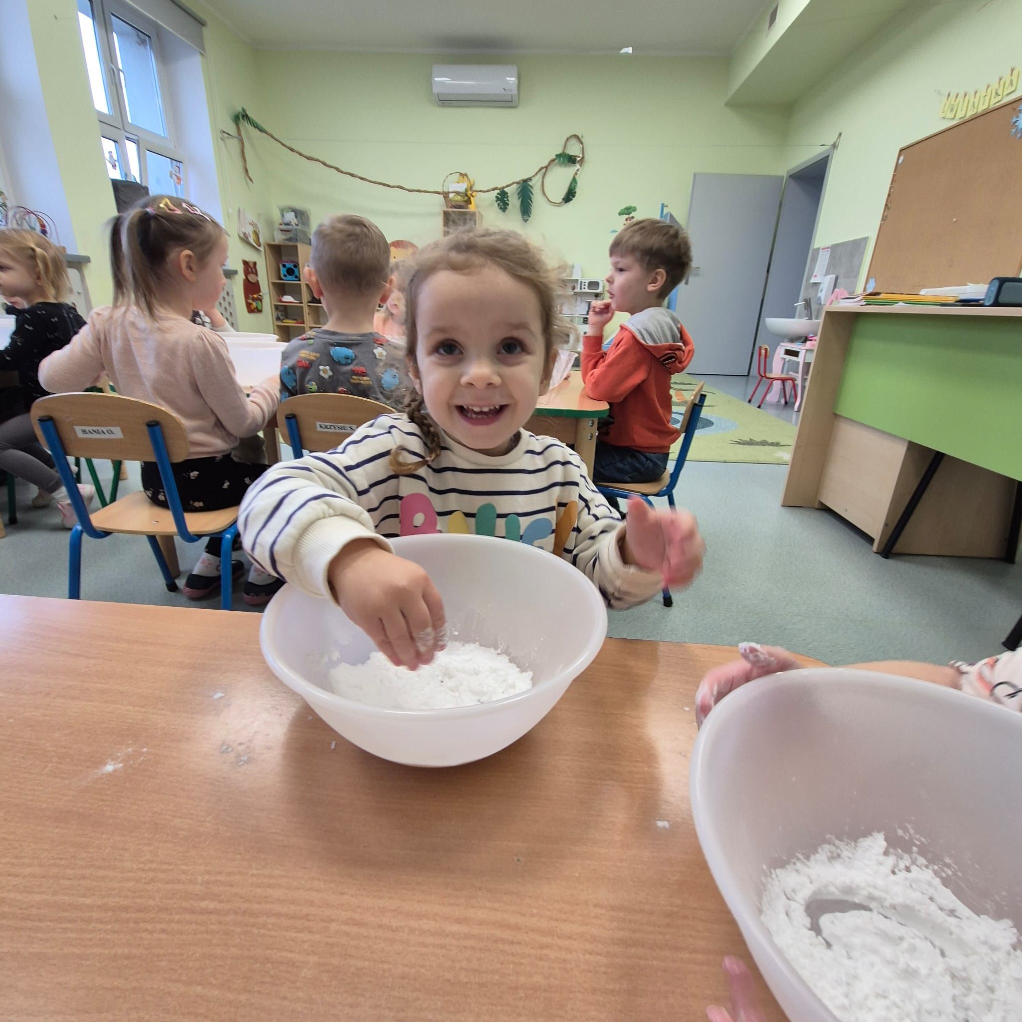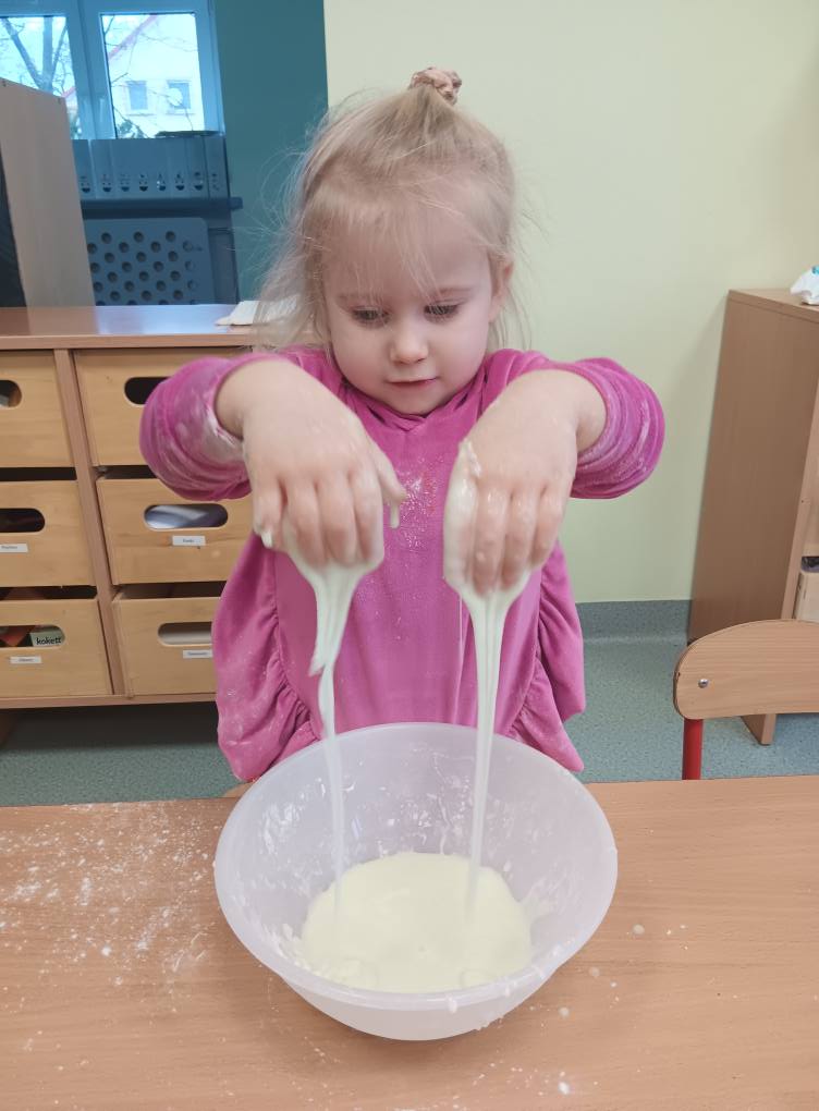 W naszej grupie zamieniliśmy się w małych naukowców. Sprawdziliśmy co stanie się gdy dodamy wodę do mąki ziemniaczanej. Było ciekawie i bardzo wesoło.