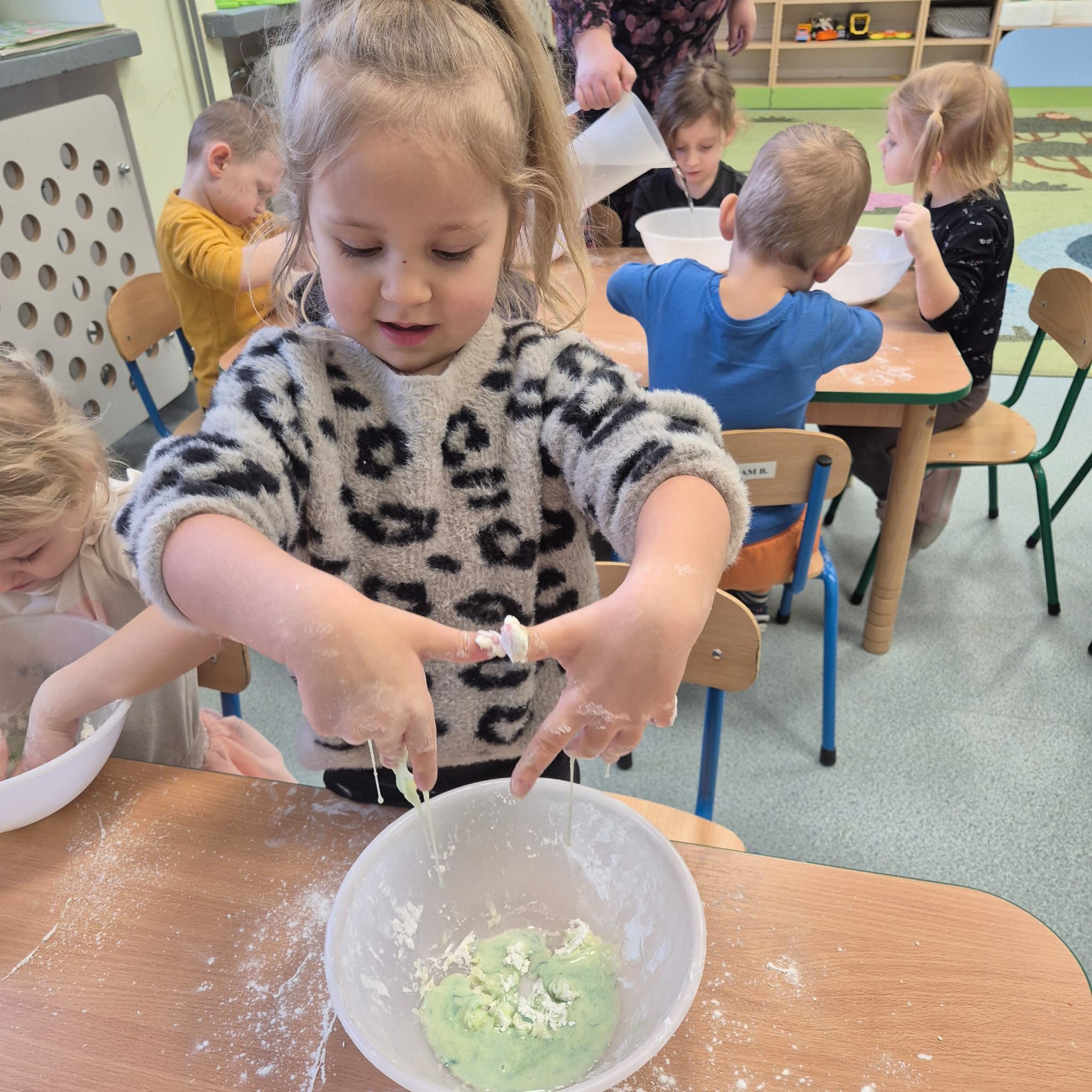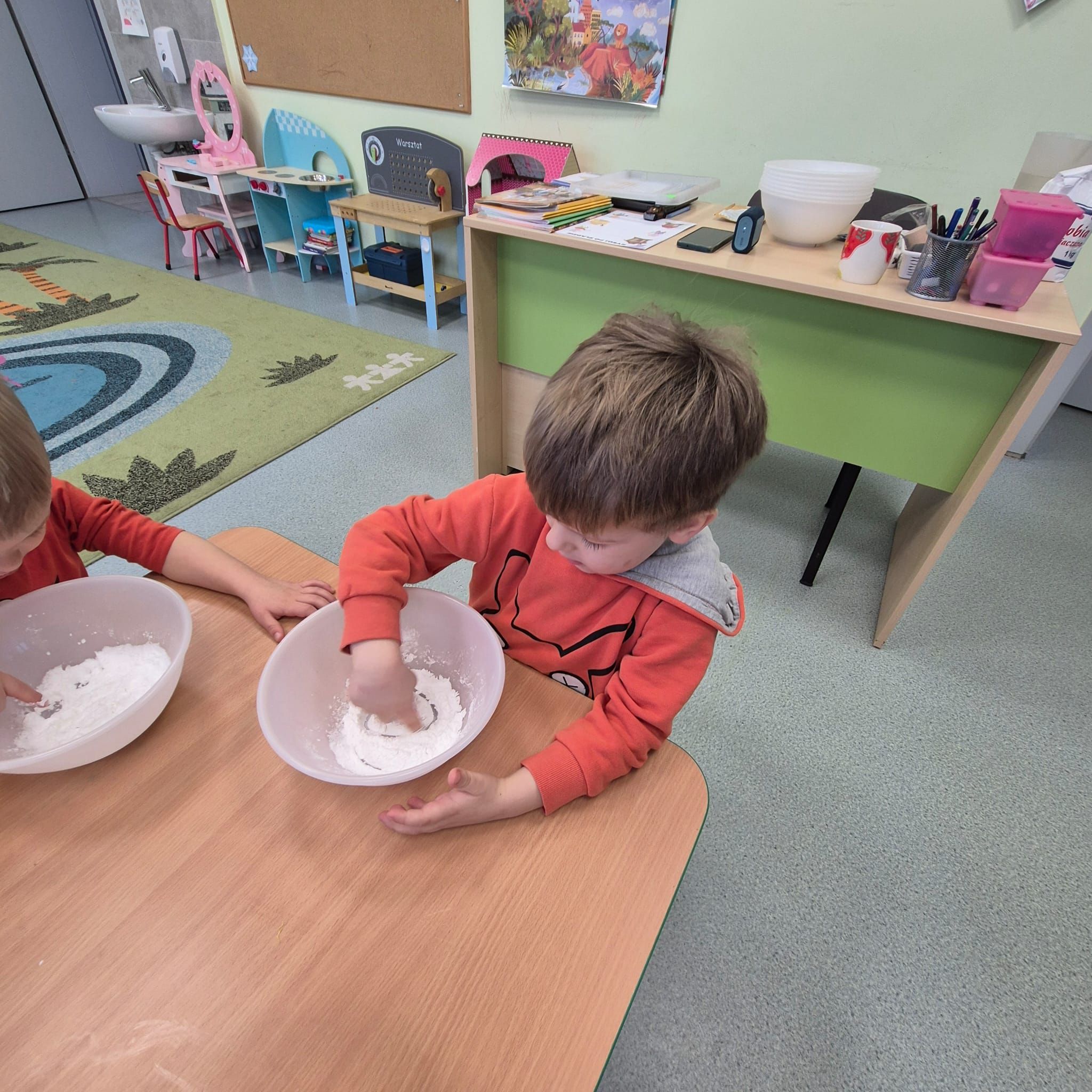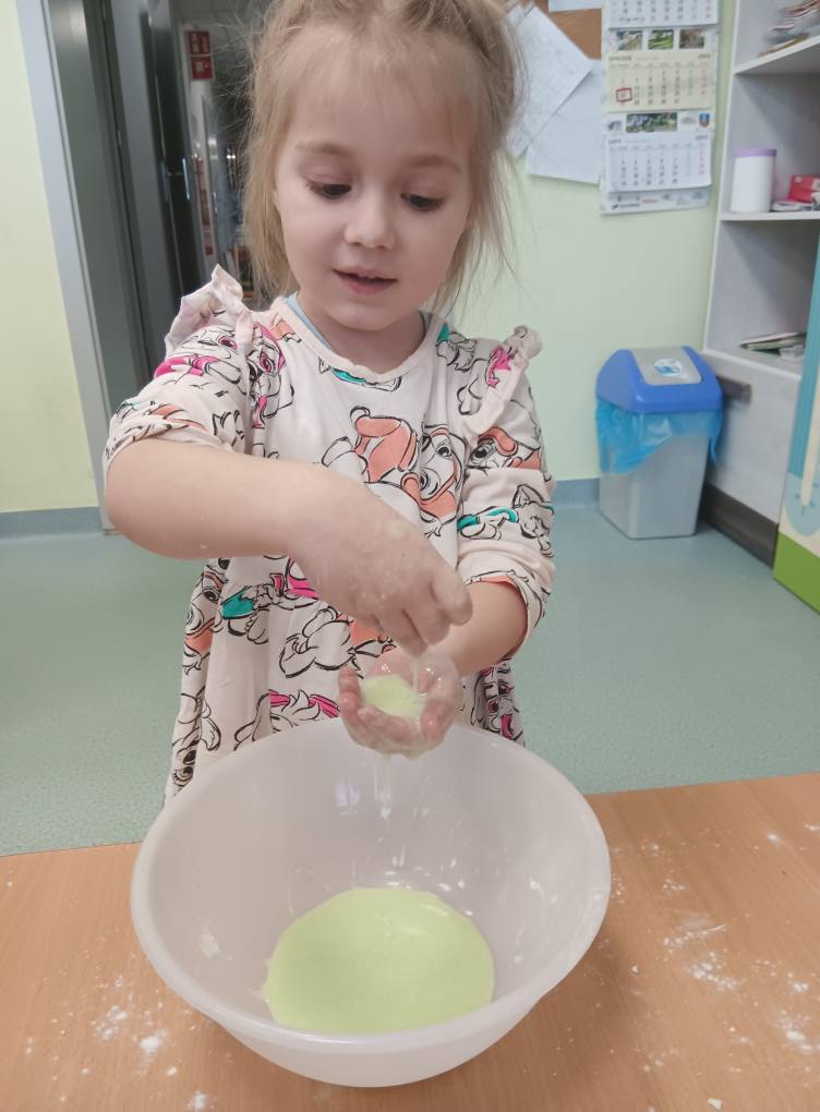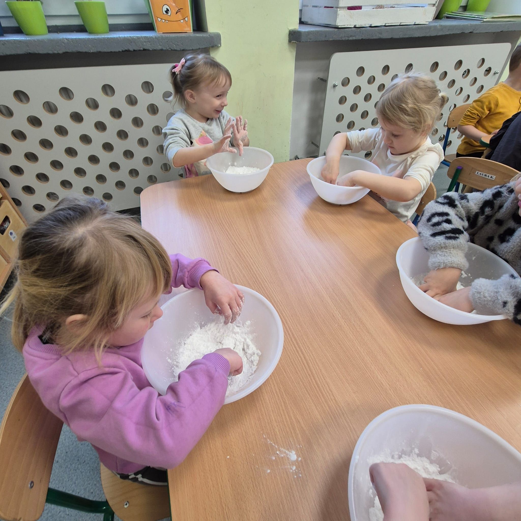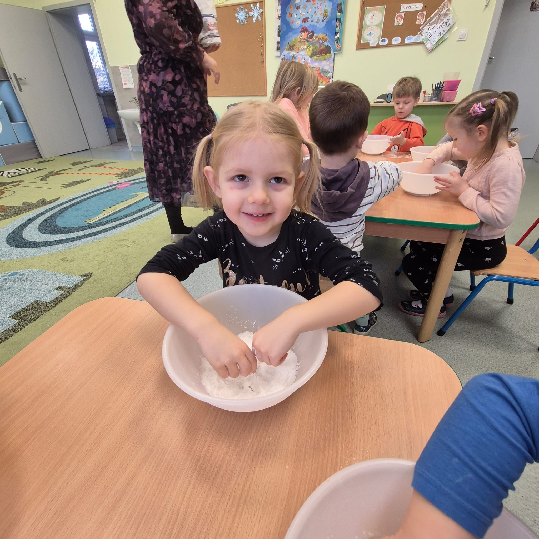 W naszej grupie zamieniliśmy się w małych naukowców. Sprawdziliśmy co stanie się gdy dodamy wodę do mąki ziemniaczanej. Było ciekawie i bardzo wesoło.