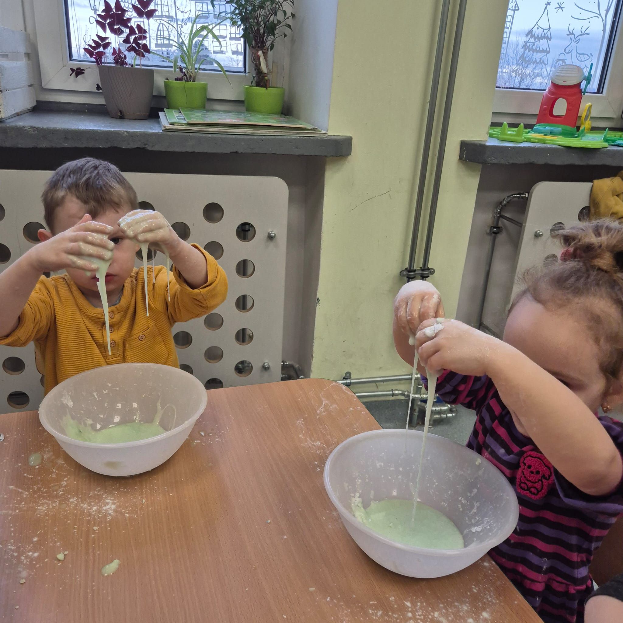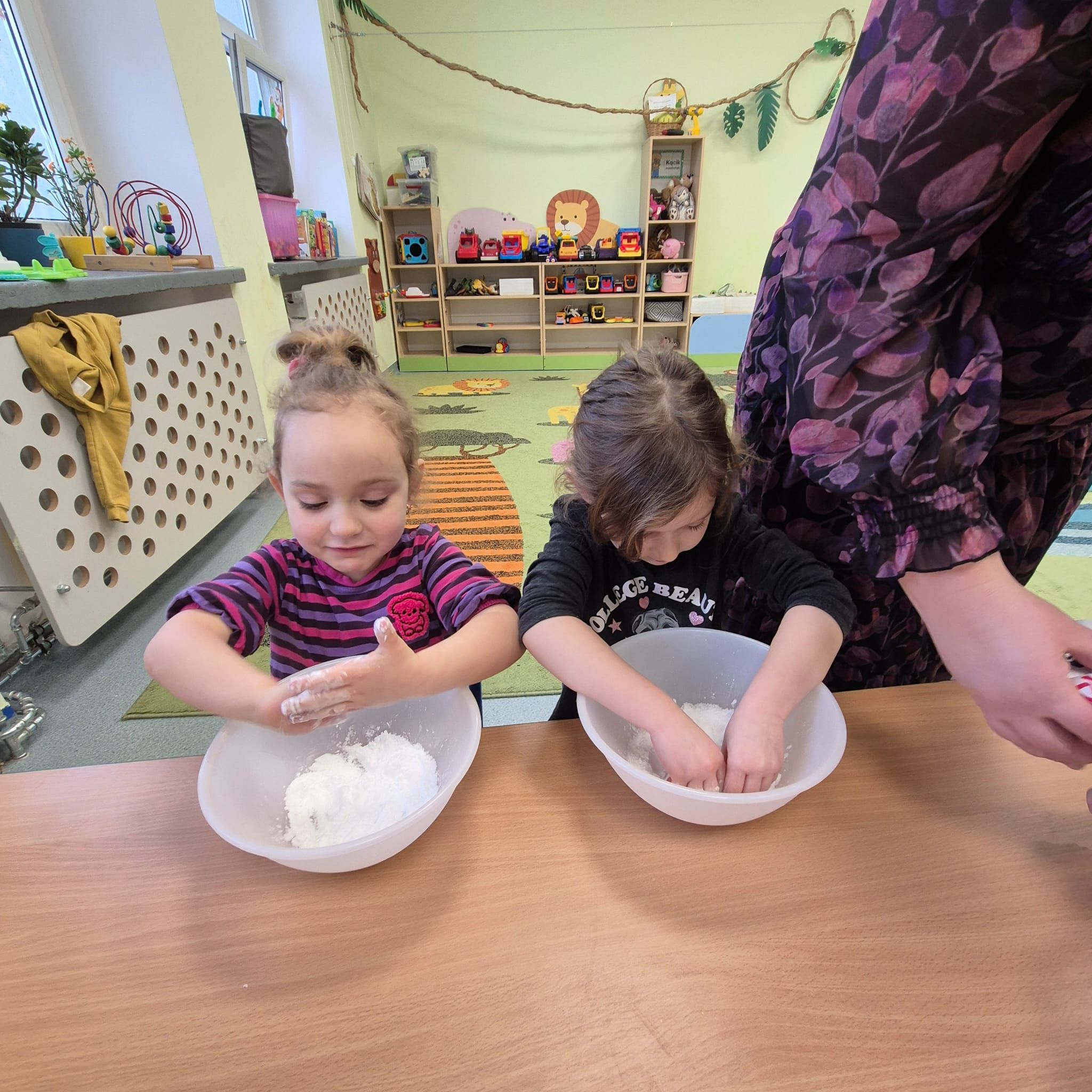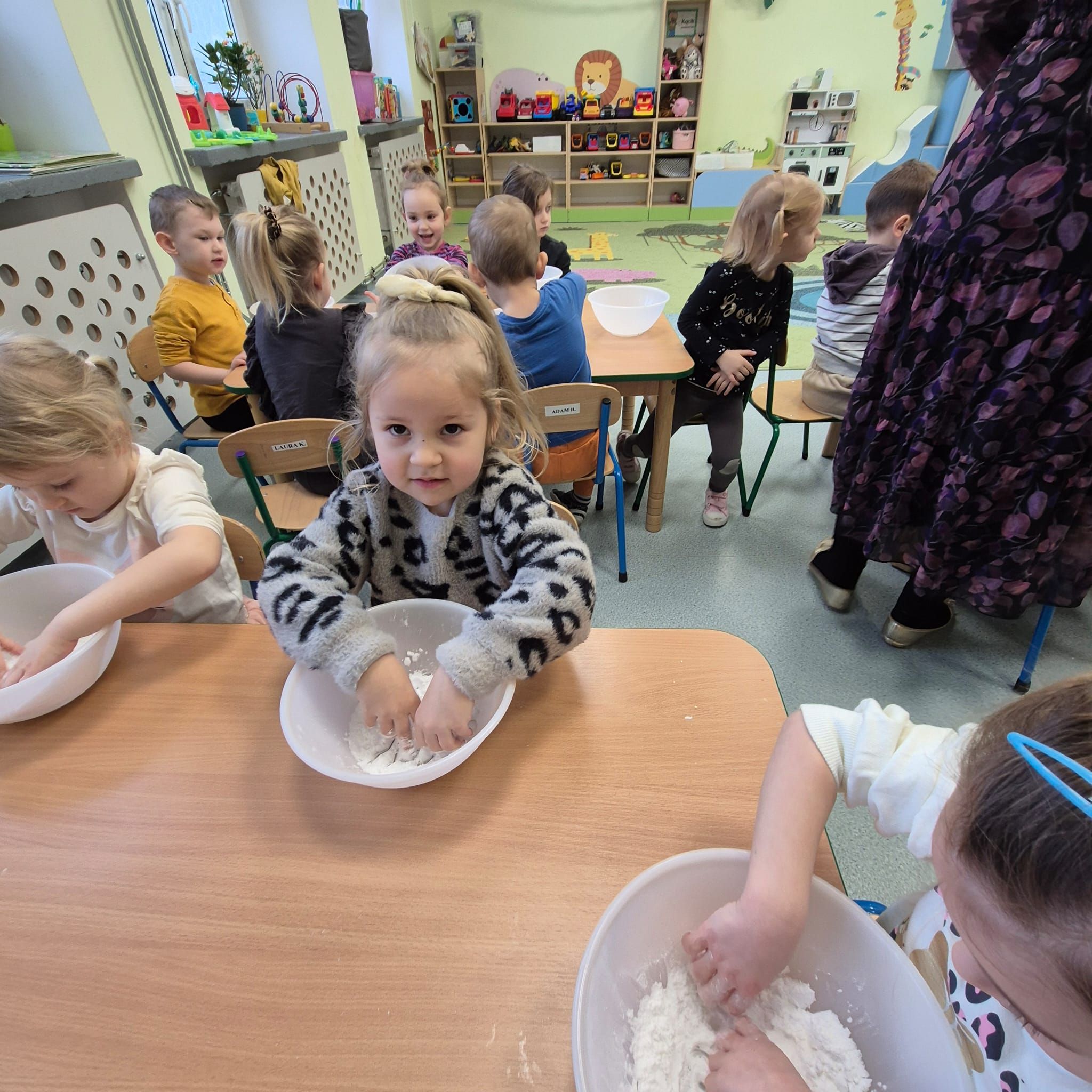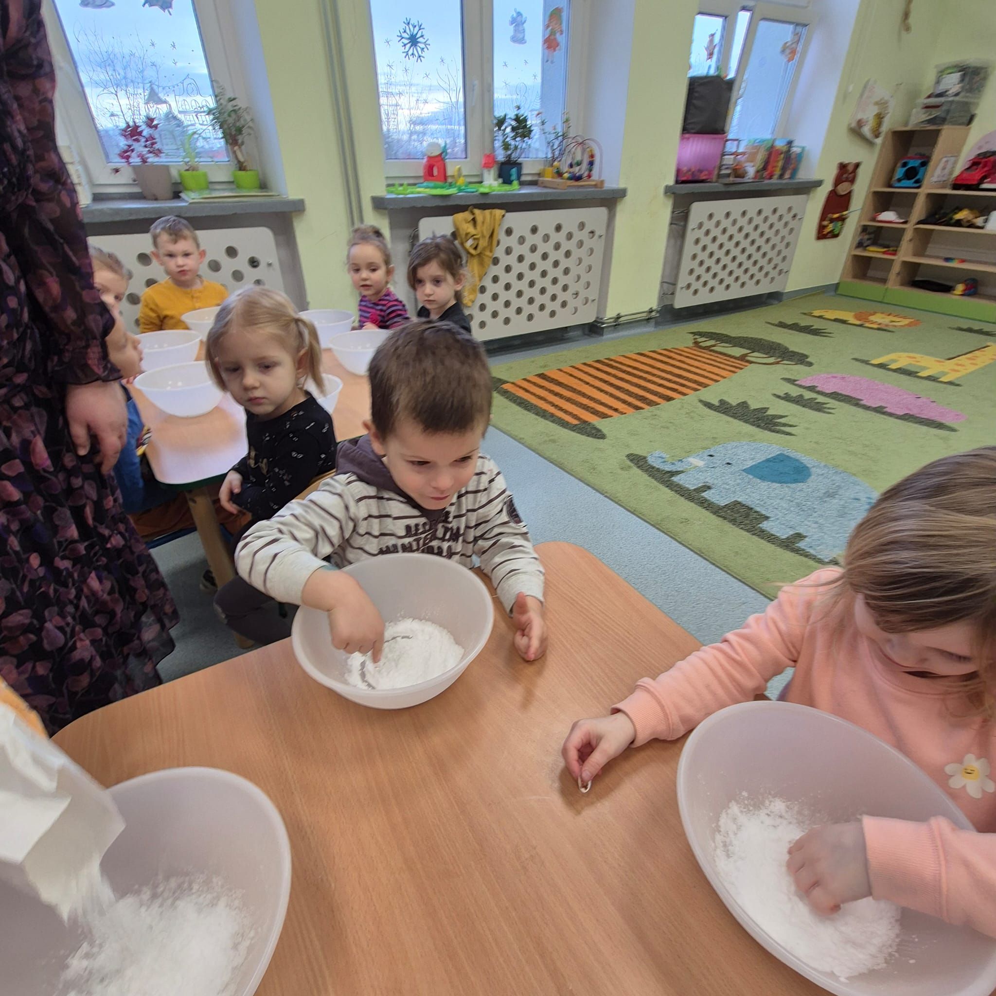 W naszej grupie zamieniliśmy się w małych naukowców. Sprawdziliśmy co stanie się gdy dodamy wodę do mąki ziemniaczanej. Było ciekawie i bardzo wesoło.