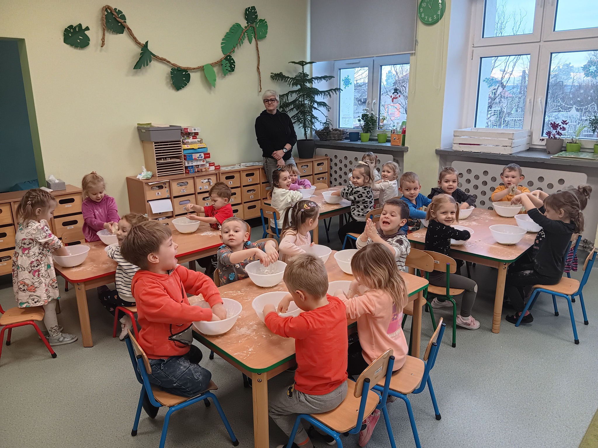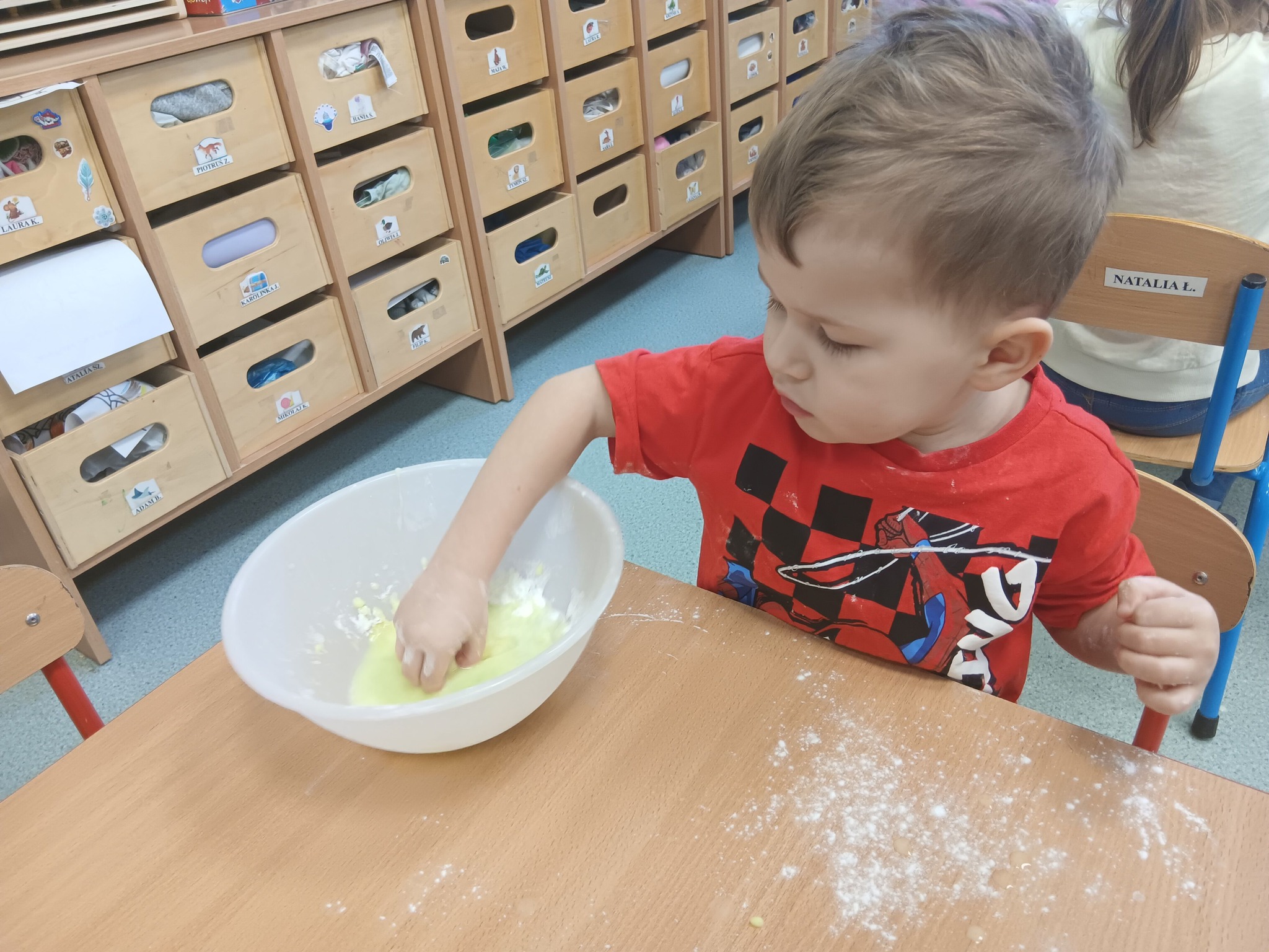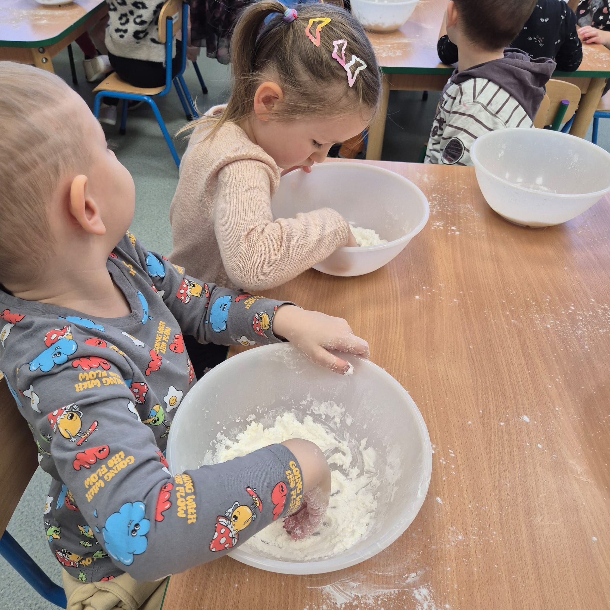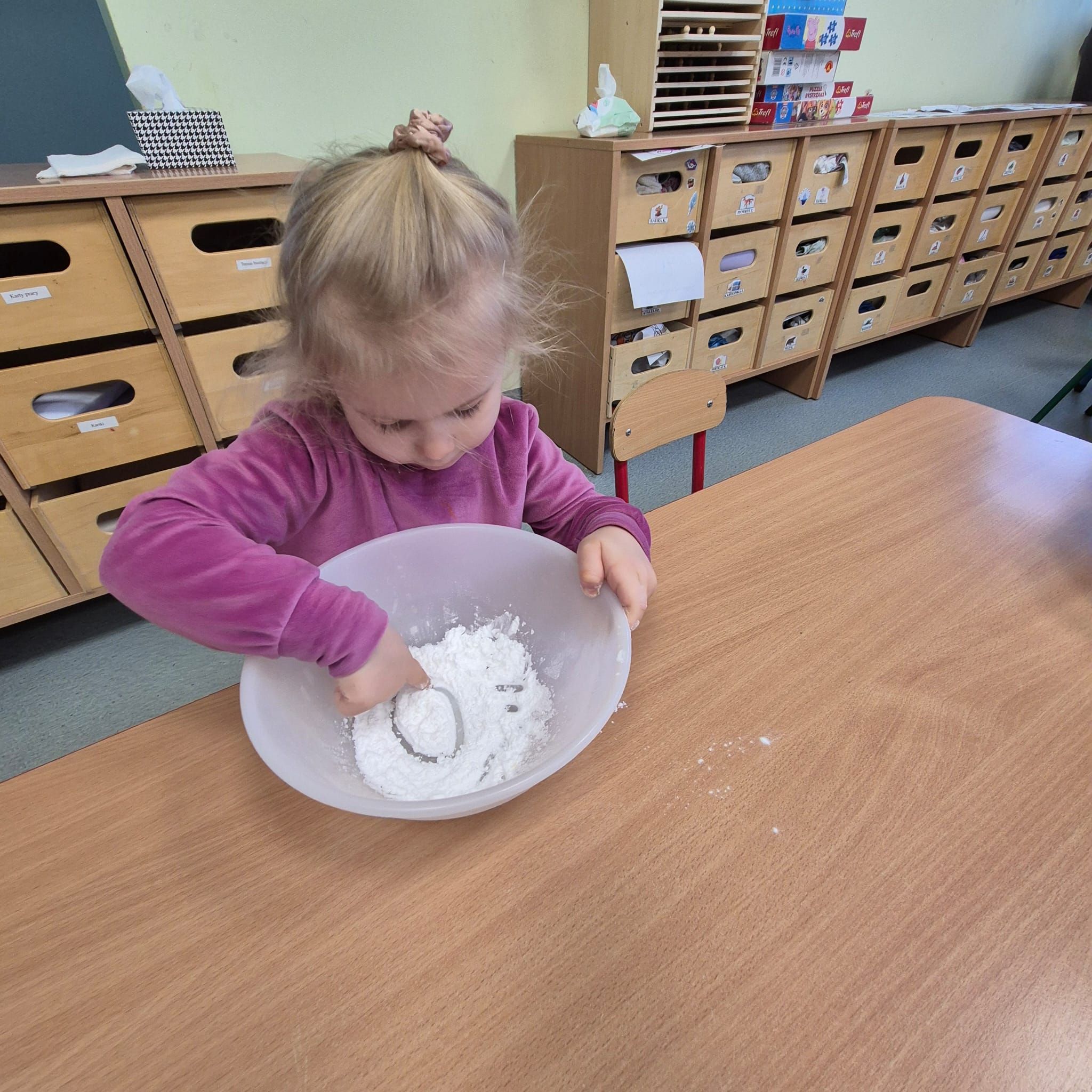 W naszej grupie zamieniliśmy się w małych naukowców. Sprawdziliśmy co stanie się gdy dodamy wodę do mąki ziemniaczanej. Było ciekawie i bardzo wesoło.