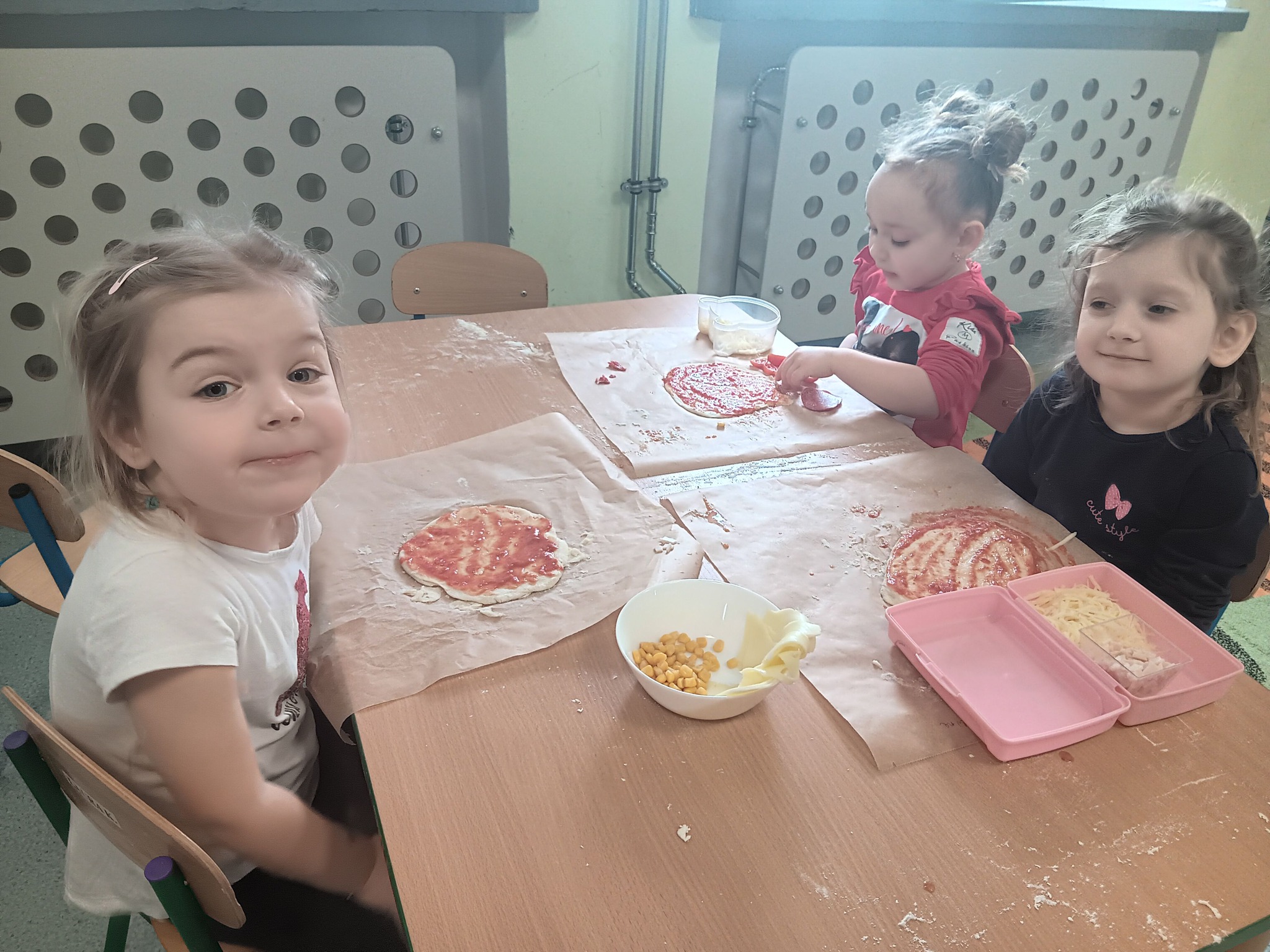 "Delfinki " z okazji Dnia pizzy samodzielnie uformowały ciasto na pizzę oraz dobrały swoje ulubione dodatki. Rozmawialiśmy o tym z jakich składników powstaje ciasto na pizzę. Po upieczeniu próbowaliśmy naszych pysznych wypieków.