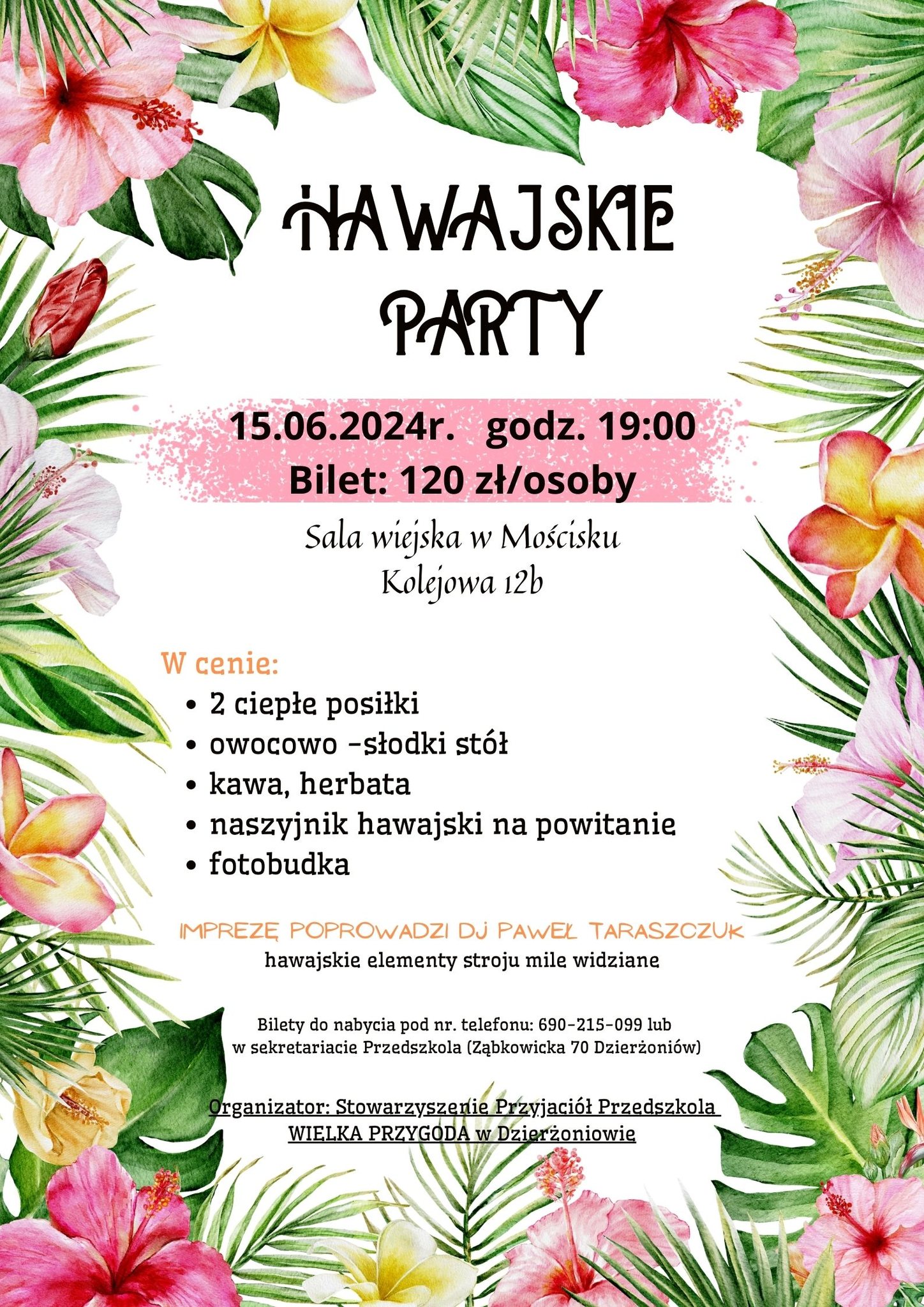 Stowarzyszenia Przyjaciół Przedszkola WIELKA PRZYODA w Dzierżoniowie organizuje Hawajskie Party 15.06.2024r. na sali wiejskiej w Mościsku.