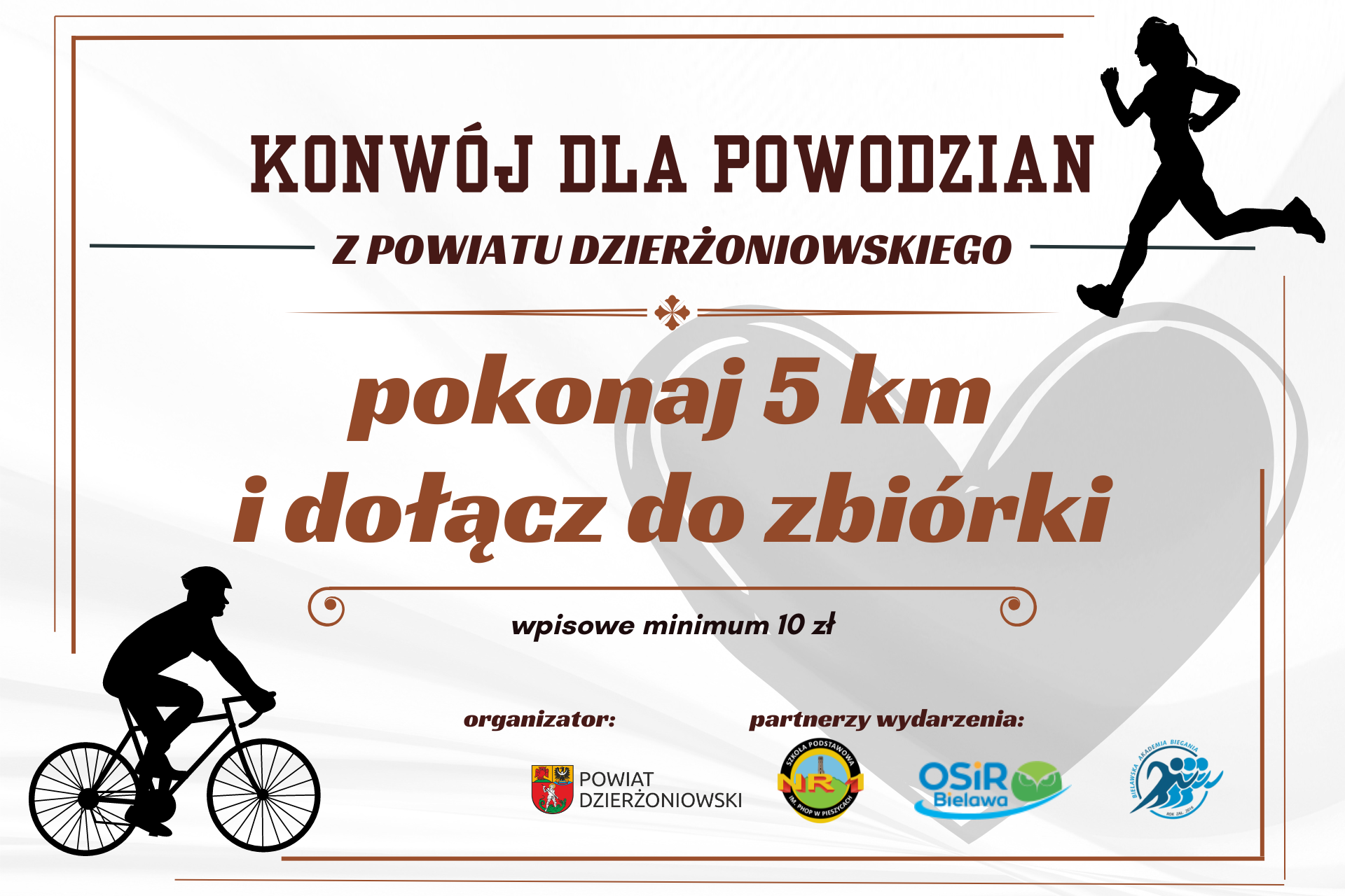 26 października w powiecie dzierżoniowskim rusza niezwykłe sportowe wydarzenie. Pokonaj minimum 5 kilometrów biegiem, marszem lub rowerem, wpłać co najmniej 10 zł na zbiórkę dla powodzian z powiatu dzierżoniowskiego i dołącz do wydarzenia.