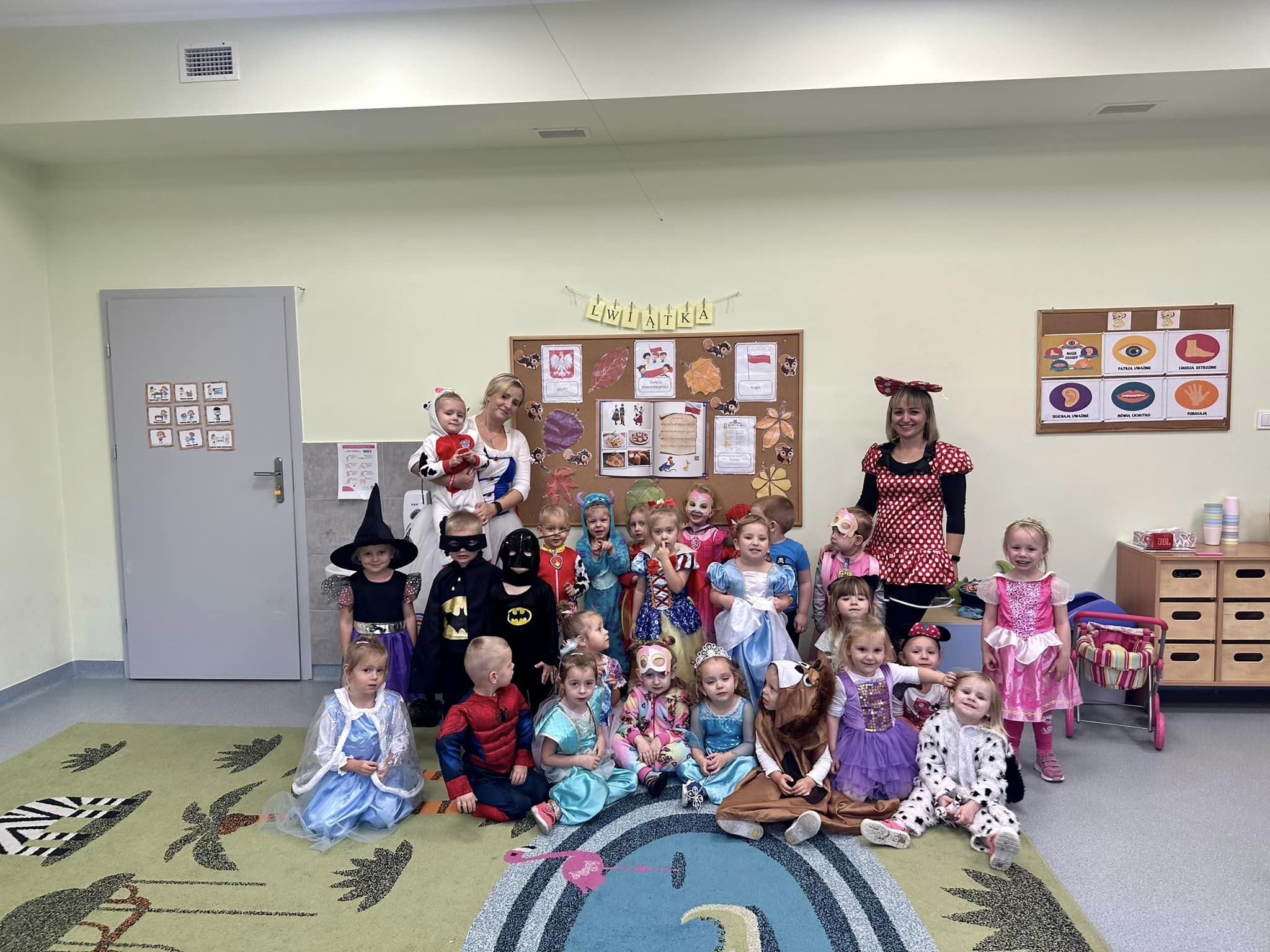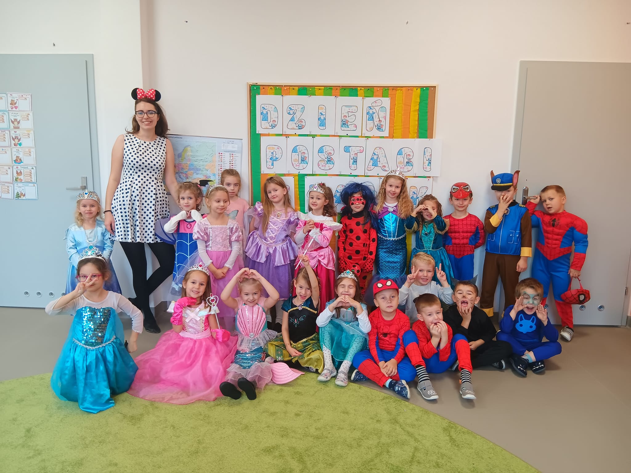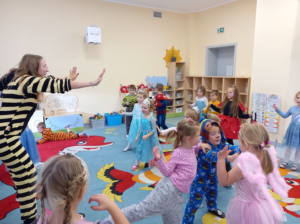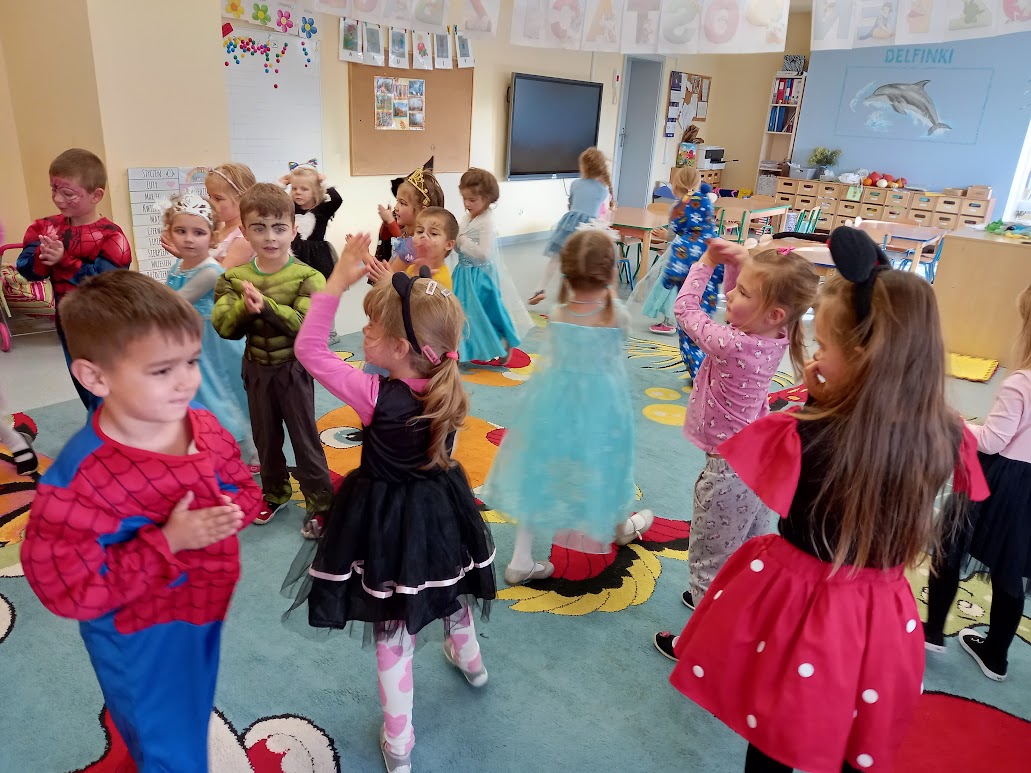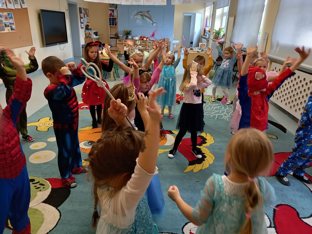 Tego dnia w naszym przedszkolu pojawiły się między innymi pięknie wystrojone księżniczki oraz wróżki. Była również Królewna Śnieżka, Myszka Miki, Elza, Spider-Man, Batman i inni bajkowi bohaterowie.